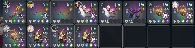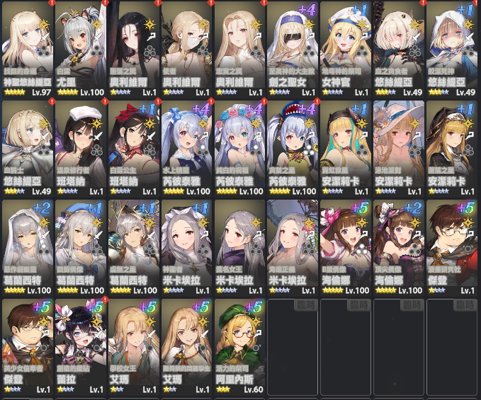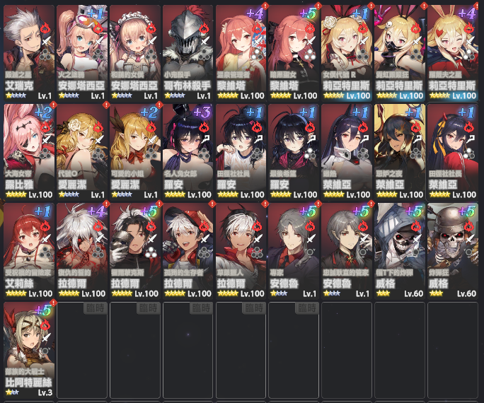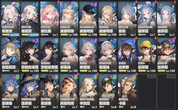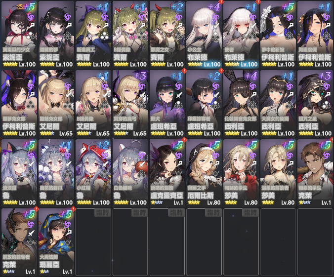 角色方面各屬性主C已達魔獸低保練度,如要捲排名或其他PVP模式可自行運用女神淚和帳號資源
