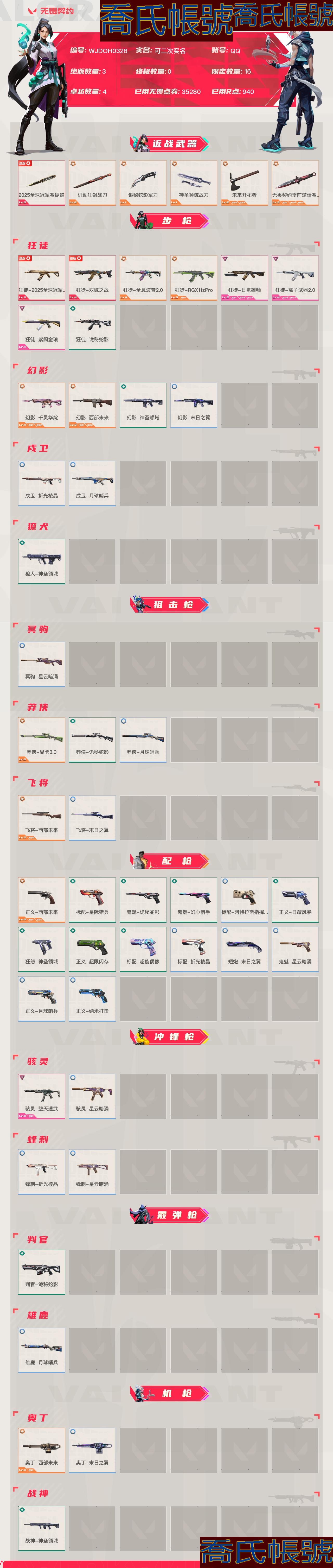 【OBWJDOH032642】Lv162 鑽石II, 刀皮數量6,槍皮數量44(絕版3限定16終極0卓越4);皮膚資產價值35280,已用R點940;【刀皮】:近戰武器-2025全球冠軍賽蝴蝶刀,近戰武器-機動狂飆戰刀,近戰武器-詭秘蛇影軍刀,近戰武器-神聖領域戰刀,近戰武器-未來開拓者,近戰武器-無畏契約季前邀請賽悲憫之刃; 【槍皮】:狂徒-2025全球冠軍賽,狂徒-雙城之戰,正義-西部未來,狂徒-全息波普2.0,狂徒-RGX11zPro,幻影-千靈華綻,幻影-西部未來,飛將-西部未來,莽俠-顯示卡3.0,奧丁-西部未來,駭靈-墮天遺武,狂徒-日冕雄師,狂徒-離子武器2.0,狂徒-紫闕金琅,標配-星際獵兵,鬼魅-詭秘蛇影,判官-詭秘蛇影,狂徒-詭秘蛇影,莽俠-詭秘蛇影,幻影-神聖領域,獠犬-神聖領域,正義-日耀風暴,正義-超限快閃記憶體,鬼魅-幻心獵手,標配-阿特拉斯指揮部,標配-超能偶像,狂怒-神聖領域,戰神-神聖領域,幻影-末日之翼,戍衛-折光稜晶,戍衛-月球哨兵,冥駒-星雲暗湧,莽俠-月球哨兵,飛將-末日之翼,正義-月球哨兵,正義-奈米打擊,鬼魅-星雲暗湧,標配-折光稜晶,短炮-末日之翼,駭靈-星雲暗湧,蜂刺-折光稜晶,蜂刺-星雲暗湧,雄鹿-月球哨兵,奧丁-末日之翼;【熱門卡面】:只剃兩邊卡面,2023VCT太平洋聯賽卡面,2023VCT美洲聯賽卡面,VCTEMEA聯賽卡面,終章戰術偶像團卡面,盡情舞動卡面,V25巴黎序曲卡面,駭靈設計圖卡面,三重威脅卡面,開拓者卡面,5週年為何而戰卡面,禁滅工牌卡面,終章TB-01戰術巨熊卡面,觸不可及卡面,再火一回卡面,身陷蝰腹卡面,5週年掌控全域性卡面,2025全球冠軍賽卡面,哨衛者之領域卡面,第五季異界洞開卡面,大軍“鴨”境卡面,第四季破局時刻卡面,終章5週年破碎卡面,5週年決意卡面,化繭成蝶卡面,夜露vs不死鳥卡面,歸鄉斯凱卡面,5週年消滅源能者卡面,5週年薪火初燃卡面,是不是哥們卡面,5週年卡面,親手縫製卡面,孤獨派對卡面,狂歡就現在卡面,設計草圖卡面,瑟瑟發抖卡面,喝杯奶茶解解壓卡面,末日之翼卡面,詭秘蛇影卡面,嚼嚼小零食卡面,兔截棍卡面,吃飯的本事卡面,幻稜工牌卡面,脫脂牛奶卡面,完好陳列卡面,貴賓限行設計圖卡面,稜彩通道卡面,勢不可擋星礈卡面,擲骰子決定先攻吧卡面,月球哨兵卡面,神聖領域卡面,星雲暗湧卡面,還是老一套卡面,鈦狐工牌卡面,莽俠設計圖卡面,宇宙大戰卡面,先驅者卡面,西部未來卡面,仿生摺疊學習卡面,靈蛇賀春卡面,晚五朝九卡面,朝九晚五卡面,光輝雙人組卡面,手柄給我卡面,午後燒烤卡面,進入射程卡面,2024改變者全球冠軍賽卡面,我眼中的世界卡面,我見識過的恐懼卡面,雙城之戰擁抱卡面,歡迎來到底城卡面,雙城之戰金克絲卡面,精靈大戰卡面,南瓜盛典卡面,VCTCN首冠卡面,戰術打碟卡面,逮到一個卡面,修車達人卡面,熱舞環節卡面,戰繩燃脂卡面,正義的化身卡面,鐵之華卡面,聲感陷阱設計圖卡面,時間到卡面,最高舞臺卡面,新兵報到卡面,代號紅色卡面,V契約卡面,夢幻奶茶卡面,無畏契約卡面;【熱門掛飾】:永結同心掛飾,電擊搖滾掛飾,V25第六幕紀念幣掛飾,致命劑量掛飾,淡定鴨掛飾,2025全球冠軍賽掛飾,蘆葦掃帚掛飾,V25第五幕紀念幣掛飾,鹽晶掛飾,來點下飯菜掛飾,紅鱗松葉掛飾,新型引擎掛飾,盆栽掛飾,V25第四幕紀念幣掛飾,5週年掛飾,捏捏球掛飾,內測金鑰掛飾,歡樂餃子掛飾,V25第三幕紀念幣掛飾,奪命毒蠍掛飾,樹懶戰術掛飾,神中神掛飾,末日之翼掛飾,詭秘蛇影掛飾,誘捕陷阱掛飾,鮮蝦手握掛飾,袖珍炮塔掛飾,折光稜晶掛飾,V25第二幕紀念幣掛飾,海豹的認可掛飾,太空熊熊掛飾,小小行星掛飾,星雲暗湧掛飾,驚嚇奶牛掛飾,激光槍掛飾,神聖領域掛飾,西部未來掛飾,走神掛飾,熱氣騰騰掛飾,V25第一幕紀念幣掛飾,悠閒雞塊掛飾,傘繩掛飾,雙城之戰小蛋糕掛飾,第九季第三幕紀念幣掛飾,終章KO小金人掛飾,工具腰帶掛飾,Z世代特飲掛飾,魚骨頭掛飾,熔岩燈掛飾,掛一掛掛飾,瞬雲履掛飾,第九季第二幕紀念幣掛飾,終章這瓜保熟掛飾,天外飛客掛飾,糖葫蘆掛飾,迷你濃縮掛飾,第九季第一幕紀念幣掛飾,無畏契約紀念幣掛飾,袖珍捷風掛飾;【熱門噴漆】:技能裡面洗澡噴漆,身負重任噴漆,高歌一曲噴漆,五週年快樂噴漆,風暴湧動噴漆,乳酪陷阱噴漆,碰個拳噴漆,2025全球冠軍賽噴漆,鴨鴨聽命噴漆,出其不意噴漆,松葉噴漆,蛇出沒注意噴漆,無人之境噴漆,酥脆一擊噴漆,扶額噴漆,5週年噴漆,暗中觀察噴漆,幸運小虎噴漆,轉個蝴蝶刀先噴漆,先走一步噴漆,睡前哭哭噴漆,毫無破綻噴漆,無處可逃噴漆,決鬥通牒噴漆,詭秘蛇影噴漆,末日之翼噴漆,看鬍子猜人噴漆,致命綻放噴漆,辣到眼睛了噴漆,滅蟲專家噴漆,折光稜晶噴漆,保持低調噴漆,閱後即焚噴漆,破梗復興噴漆,旋轉門噴漆,我摯愛的傑作噴漆,捲心菜之靈噴漆,汗流浹背噴漆,塗鴉速度噴漆,嗨寶飛濺噴漆,困來如山倒噴漆,真煩人噴漆,神聖領域噴漆,貓貓錯了噴漆,子彈時間噴漆,月球哨兵噴漆,星雲暗湧噴漆,就你和我噴漆,西部未來噴漆,GG彈噴漆,年年有芋噴漆,大打出爪噴漆,完美得分噴漆,嗨寶南瓜燈噴漆,易如反掌噴漆,鬱悶刷屏噴漆,都算到了噴漆,控場勿近噴漆,小丑貓噴漆,熊抱噴漆,尷尬時刻噴漆,買裝還是存錢噴漆,驚聲尖叫噴漆,水晶球噴漆,2021冠軍巡迴賽花火噴漆,拼一槍噴漆,超級粉絲噴漆,勝利屬於無畏契約噴漆,GLHF噴漆,捷風差距噴漆,無畏契約噴漆;【皮膚可能含有某些特權皮膚,具體以遊戲內實際擁有為準】