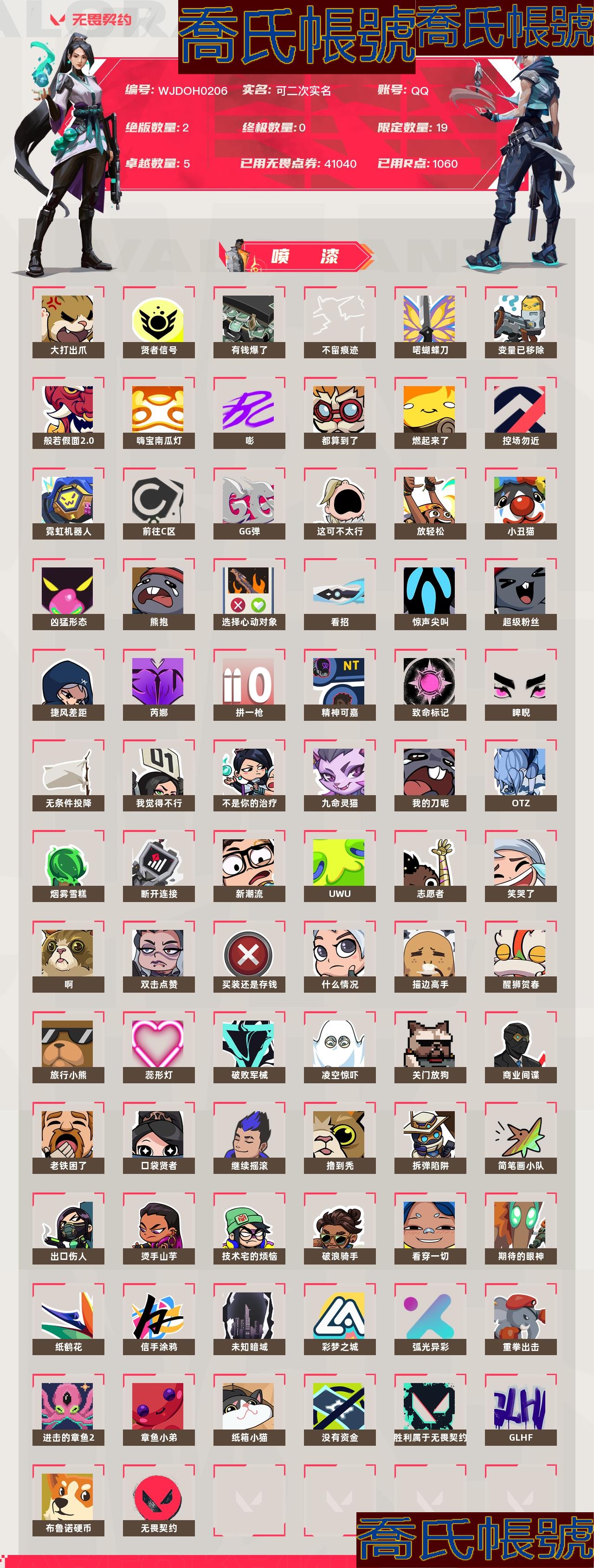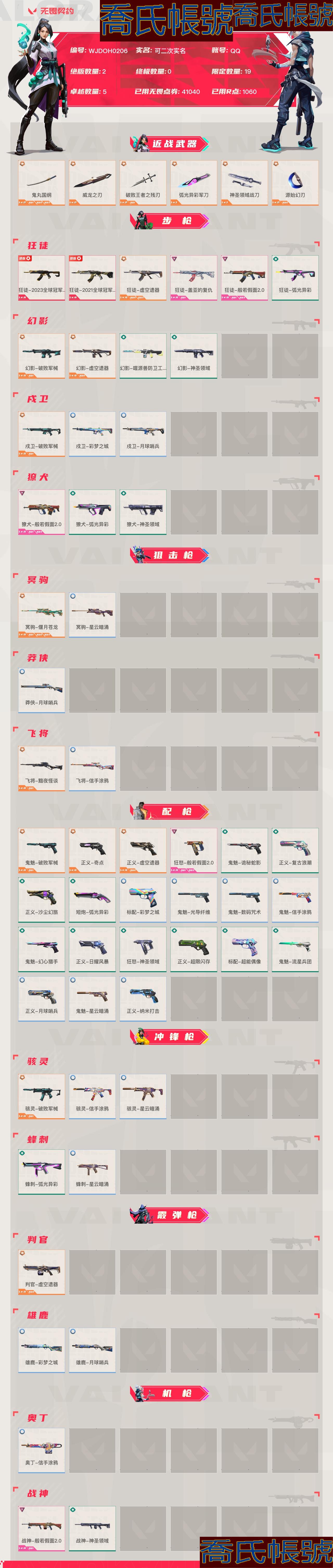 【OBWJDOH020642】Lv274 未定級, 刀皮數量6,槍皮數量53(絕版2限定19終極0卓越5);皮膚資產價值41040,已用R點1060;【刀皮】:近戰武器-鬼丸國綱,近戰武器-威龍之刃,近戰武器-破敗王者之殘刃,近戰武器-弧光異彩軍刀,近戰武器-神聖領域戰刀,近戰武器-源始幻刃; 【槍皮】:狂徒-2023全球冠軍賽,狂徒-2021全球冠軍賽,鬼魅-破敗軍械,正義-奇點,正義-虛空遺器,駭靈-破敗軍械,判官-虛空遺器,狂徒-虛空遺器,幻影-破敗軍械,幻影-虛空遺器,戍衛-破敗軍械,冥駒-偃月蒼龍,飛將-黯夜怪談,狂怒-般若假面2.0,狂徒-蓋亞的復仇,狂徒-般若假面2.0,獠犬-般若假面2.0,戰神-般若假面2.0,鬼魅-詭秘蛇影,正義-復古浪潮,正義-沙塵幻旅,短炮-弧光異彩,蜂刺-弧光異彩,狂徒-弧光異彩,幻影-噬源獸防衛工程,獠犬-弧光異彩,標配-彩夢之城,鬼魅-光導纖維,鬼魅-數碼咒術,鬼魅-信手塗鴉,駭靈-信手塗鴉,雄鹿-彩夢之城,戍衛-彩夢之城,飛將-信手塗鴉,奧丁-信手塗鴉,幻影-神聖領域,獠犬-神聖領域,正義-日耀風暴,正義-超限快閃記憶體,鬼魅-幻心獵手,鬼魅-流星兵團,標配-超能偶像,狂怒-神聖領域,戰神-神聖領域,戍衛-月球哨兵,冥駒-星雲暗湧,莽俠-月球哨兵,正義-月球哨兵,正義-奈米打擊,鬼魅-星雲暗湧,駭靈-星雲暗湧,蜂刺-星雲暗湧,雄鹿-月球哨兵;【熱門卡面】:終章戰術偶像團卡面,V25巴黎序曲卡面,盡情舞動卡面,新兵訓練兩山壁立卡面,深夜小吃卡面,三重威脅卡面,蟲巢心智卡面,5週年為何而戰卡面,禁滅工牌卡面,試驗場卡面,5週年掌控全域性卡面,幻稜工牌卡面,再火一回卡面,身陷蝰腹卡面,大軍“鴨”境卡面,第四季破局時刻卡面,5週年消滅源能者卡面,排除故障卡面,5週年薪火初燃卡面,暮蝶工牌卡面,5週年卡面,是不是哥們卡面,親手縫製卡面,孤獨派對卡面,狂歡就現在卡面,雷茲的一天卡面,無畏之蟻卡面,設計草圖卡面,賢者之淚卡面,情人節不死鳥卡面,完好陳列卡面,貴賓限行設計圖卡面,擲骰子決定先攻吧卡面,勢不可擋星礈卡面,神聖領域卡面,星雲暗湧卡面,還是老一套卡面,鈦狐工牌卡面,莽俠設計圖卡面,月球哨兵卡面,宇宙大戰卡面,虛空遺器卡面,稜彩通道卡面,海灘度假卡面,戰術小夥伴卡面,仿生摺疊學習卡面,靈蛇賀春卡面,晚五朝九卡面,我會回來的卡面,朝九晚五卡面,虹光荊棘卡面,光輝雙人組卡面,手柄給我卡面,午後燒烤卡面,腳踝終結者卡面,峽谷騎手卡面,進入射程卡面,沒有什麼能逃過我的眼睛卡面,般若假面2.0卡面,雙城之戰金克絲卡面,雙城之戰擁抱卡面,歡迎來到底城卡面,歸鄉尚勃勒卡面,精靈大戰卡面,南瓜盛典卡面,戰術打碟卡面,最好的留到最後卡面,古典雕塑卡面,戰術兔之怒卡面,修車達人卡面,正義的化身卡面,終章生意人麥寶卡面,鐵之華卡面,夜露工牌卡面,時間到卡面,最高舞臺卡面,聲感陷阱設計圖卡面,夢幻奶茶卡面,趁熱吃卡面,源能反應卡面,零點嗅探設計圖卡面,KO擊倒卡面,縛魔武器卡面,表象之下卡面,歸鄉芮娜卡面,沙雕爆能器卡面,清除名單卡面,九命靈貓卡面,化繭成蝶卡面,無可失去卡面,龍記卡面,完美調諧卡面,破敗軍械卡面,暗槍卡面,鐵臂vs雷茲卡面,Luie卡面,夯實根基卡面,熱烈歡迎卡面,夜露vs不死鳥卡面,鐵臂設計圖卡面,百彈不侵卡面,捷風vs捷風卡面,軍團卡面,幽影行者卡面,友軍火力卡面,最新一期卡面,戰鬥賢者卡面,不要鬆手卡面,維特魯威皮蛋卡面,奈米炸彈卡面,潮湧卡面,舊路重遊卡面,彩夢之城卡面,弧光異彩卡面,信手塗鴉卡面,冰淇淋店卡面,黃金時刻卡面,冠軍小隊卡面,當心墜落卡面,萬事如意卡面,代號紅色卡面,新兵報到卡面,爆彈機器人設計圖卡面,V契約卡面,無畏契約卡面;【熱門掛飾】:V25第六幕神話掛飾,電擊搖滾掛飾,V25第六幕紀念幣掛飾,淡定鴨掛飾,致命劑量掛飾,V25第五幕紀念幣掛飾,新型引擎掛飾,盆栽掛飾,V25第四幕紀念幣掛飾,V25第三幕神話掛飾,5週年掛飾,捏捏球掛飾,內測金鑰掛飾,歡樂餃子掛飾,V25第三幕紀念幣掛飾,神中神掛飾,樹懶戰術掛飾,誘捕陷阱掛飾,V25第二幕紀念幣掛飾,星雲暗湧掛飾,太空熊熊掛飾,驚嚇奶牛掛飾,激光槍掛飾,神聖領域掛飾,虛空遺器掛飾,小小行星掛飾,走神掛飾,熱氣騰騰掛飾,V25第一幕紀念幣掛飾,第九季神話掛飾,悠閒雞塊掛飾,般若假面2.0掛飾,雙城之戰小蛋糕掛飾,傘繩掛飾,第九季第三幕紀念幣掛飾,終章KO小金人掛飾,工具腰帶掛飾,熔岩燈掛飾,第九季第二幕紀念幣掛飾,終章這瓜保熟掛飾,糖葫蘆掛飾,袖珍捷風掛飾,迷你濃縮掛飾,靈魂膠囊掛飾,第九季第一幕紀念幣掛飾,第八季超凡掛飾,戰術河童掛飾,熒光棒掛飾,第八季第三幕紀念幣掛飾,天外飛客掛飾,瓶中信掛飾,傳世蓮華掛飾,第八季第二幕紀念幣掛飾,凌雲天縱掛飾,酷閃輪滑掛飾,好運福爪掛飾,瞄這裡掛飾,破敗軍械掛飾,第八季第一幕紀念幣掛飾,彩糖麵包掛飾,冬日絮語掛飾,第七季第三幕紀念幣掛飾,幸運中國結掛飾,蓄勢待滾掛飾,人生如摩天輪有起有落掛飾,秘食餐車掛飾,多肉水晶掛飾,空中接力掛飾,中秋月餅掛飾,弧光異彩掛飾,彩夢之城掛飾,落日滑板車掛飾,第七季第二幕紀念幣掛飾,機器夥伴掛飾,章魚小弟掛飾,嗦面掛飾,黃金時間掛飾,無畏契約紀念幣掛飾;【熱門噴漆】:技能裡面洗澡噴漆,身負重任噴漆,高歌一曲噴漆,求求你了噴漆,五週年快樂噴漆,風暴湧動噴漆,乳酪陷阱噴漆,鴨鴨聽命噴漆,碰個拳噴漆,酥脆一擊噴漆,5週年噴漆,銳舞章魚噴漆,暗中觀察噴漆,