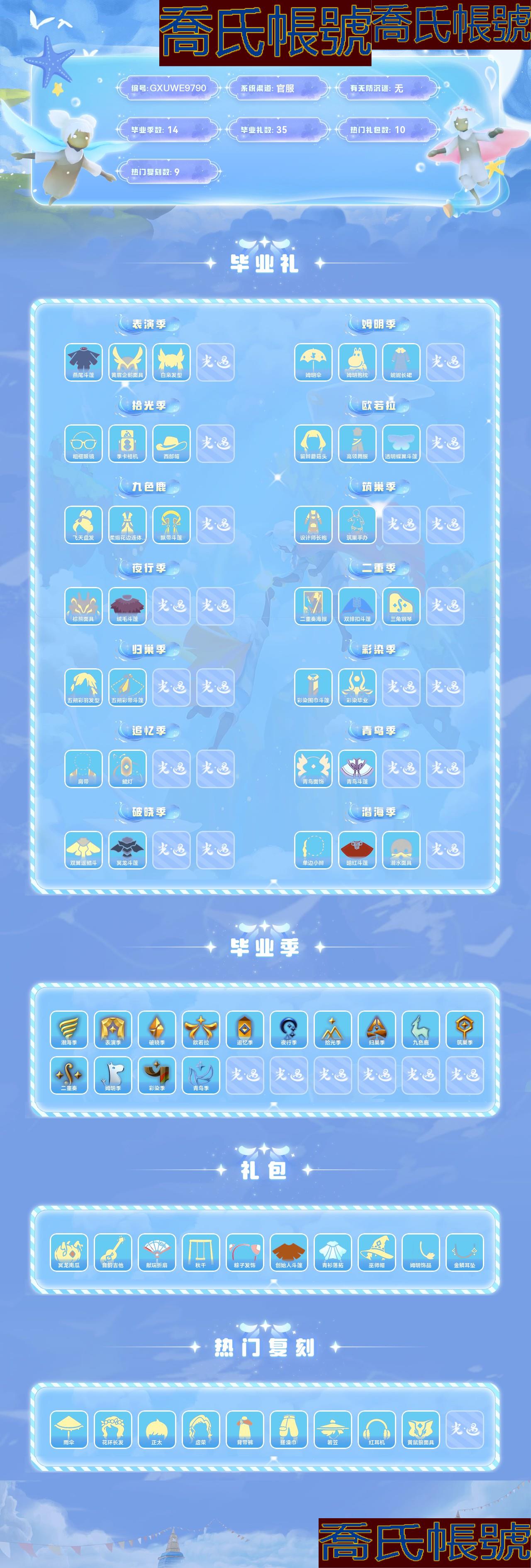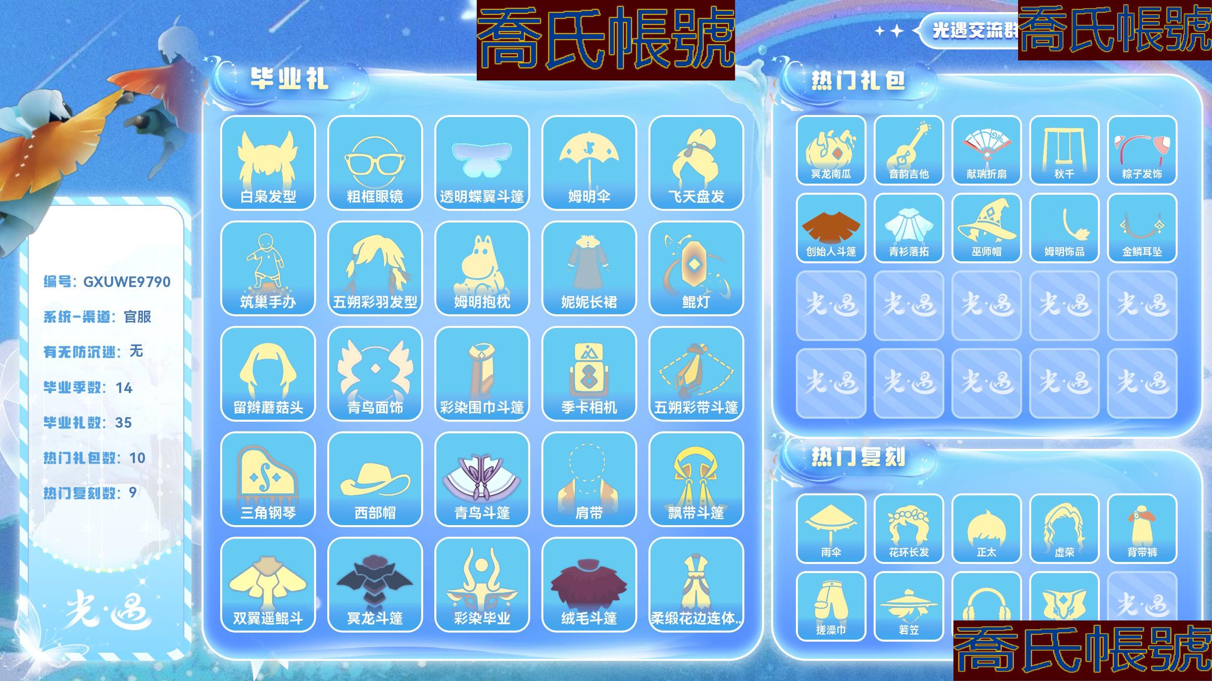 【OBGXUWE979042】蠟燭299,愛心319,昇華蠟燭1,光翼124;畢業季:潛海季,表演季,破曉季,歐若拉,追憶季,夜行季,拾光季,歸巢季,九色鹿,築巢季,二重奏,姆明季,彩染季,青鳥季;面具:黃鼠狼面具;斗篷:創始人斗篷,青衫落拓;髮型:白梟髮型,正太,虛榮,花環長髮;耳飾:金鱗耳墜;頭飾:粽子髮飾;項鍊:姆明飾品;褲子:背帶褲,搓澡巾;帽子:巫師帽,紅耳機,箬笠;背飾:雨傘,音韻吉他,鞦韆,獻瑞摺扇,鯤燈,冥龍南瓜;【官服】