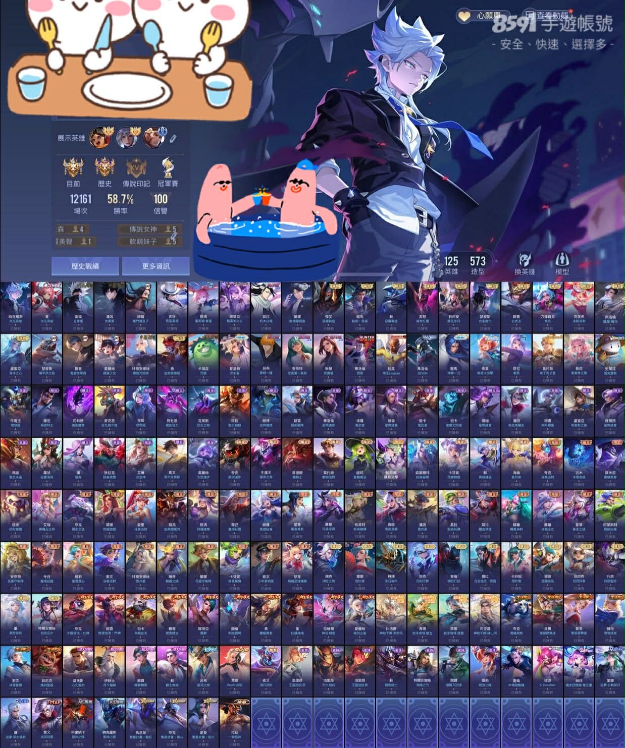 帳號 【Garena帳有綁定、先鋒傳說·新月、V9、125英、573造】 雙次元 五條伏黑 彌豆子 朽木 庫洛米 雙惡魔 滅世基德鏡花假面蜜莉姆都全套