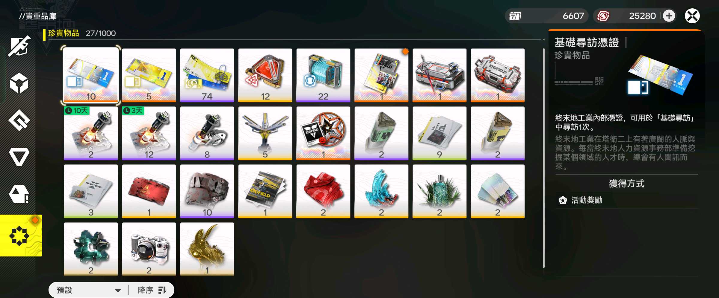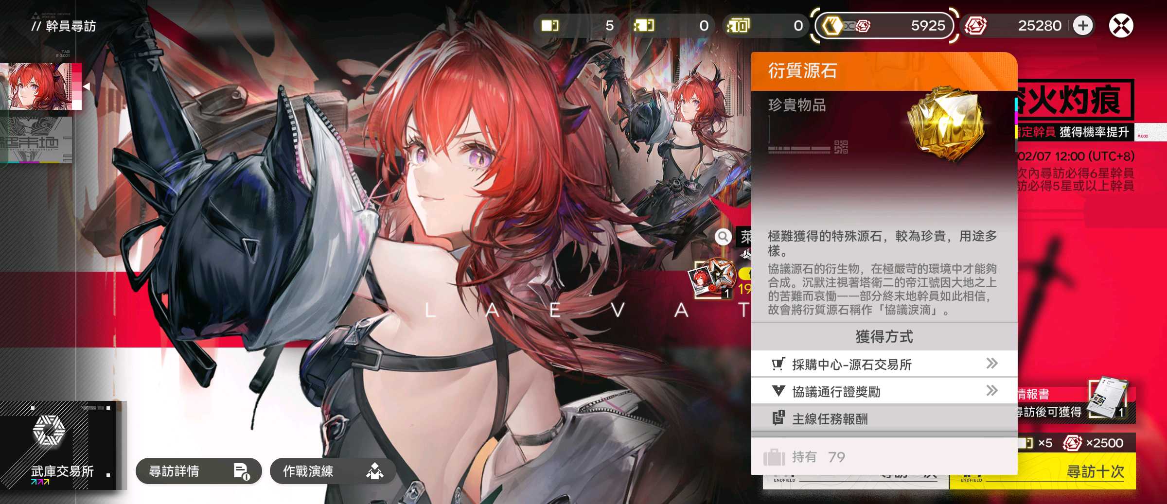 49等 79源石+25000嵌晶玉 源石協議已開 萊萬叮+專武/技能全 Rank9 目前90等 6星武器:宏願+1命契子+2自選6星武器 駿衛+1命小羊 主線解完 支線及地圖幾乎沒解 5特級卷+10基礎卷(差221自選)紫電池基本小畢業 基本0探索