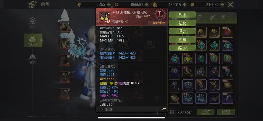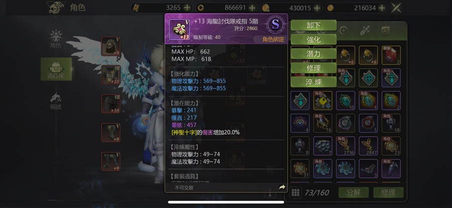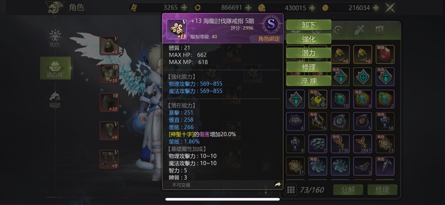 3S飾品(光暗戒) 潛力數值如圖 圖鑑等級108 (L圖鑑1張貝斯柯德)