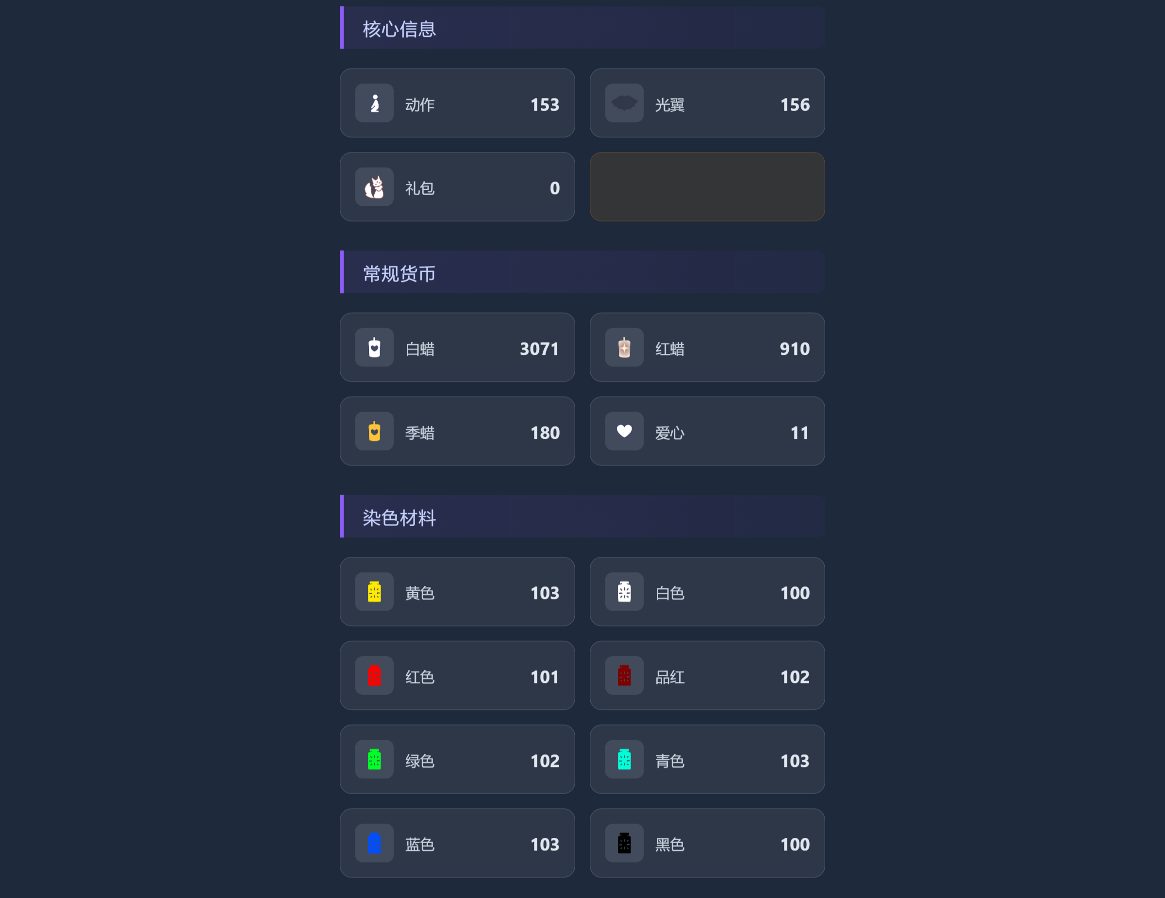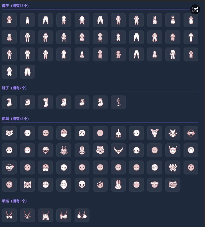 物品:武士褲 正太 搓澡巾 貓貓頭 虛榮 雨傘 總裁連體褲 小王子擊劍褲子 狼尾 白棉褲 棕熊尾巴 海洋武士褲子  雪人褲 寶寶褲  燕尾服 滑雪板 工裝背帶褲 彩虹褲子 聖誕鬥篷 聖誕椅子 聖誕帽 聖誕圍脖 六周年褲子 虛榮 軍帽  貓貓頭 貓貓帽子 櫻花 爆炸雨媽 瘋帽匠 姚坤發型 擋風鏡馬尾 短人面具 偽黑臉面具 黃鼠狼   僵屍貼   兔子面具 龍面具 老虎面具  玫瑰面具  海洋面具 櫻花鬥篷 蔚紫鬥篷 郁金香鬥篷 紫虅蘿鬥篷 菱形鬥篷 彩虹鬥篷……裝扮280多件(還有很多沒列舉出來的看圖)