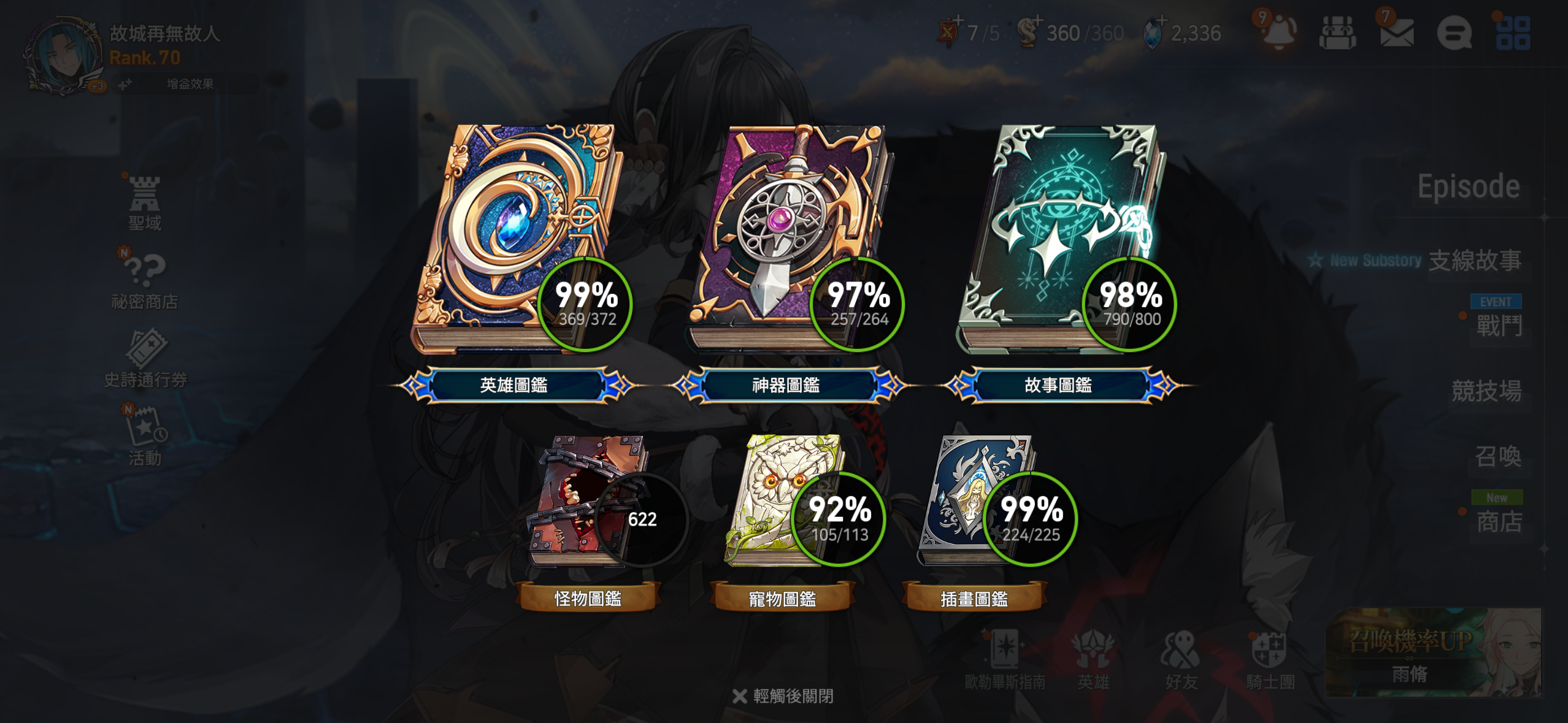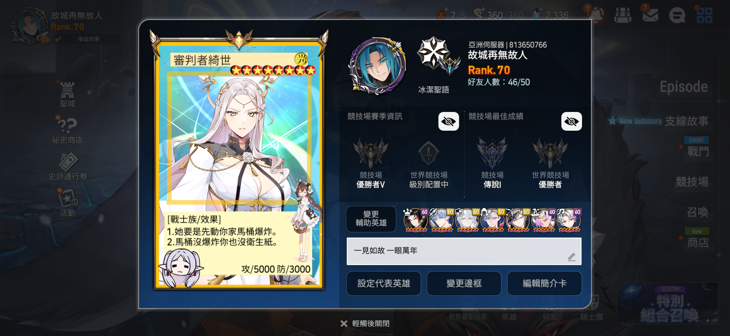 第七史詩部分 都我自己在玩 整個信箱可移交 有問題可以找我 隨時 相當適合養老 月卡剛買沒幾天 防守穩定5000 遠征全自動一刀 星座永劫光暗需要手動 惡夢都配好了 該買的限定沒有一個落下 該打的都打好了 月光幣還有40 也就是說就剩新光暗 其他都能拿
