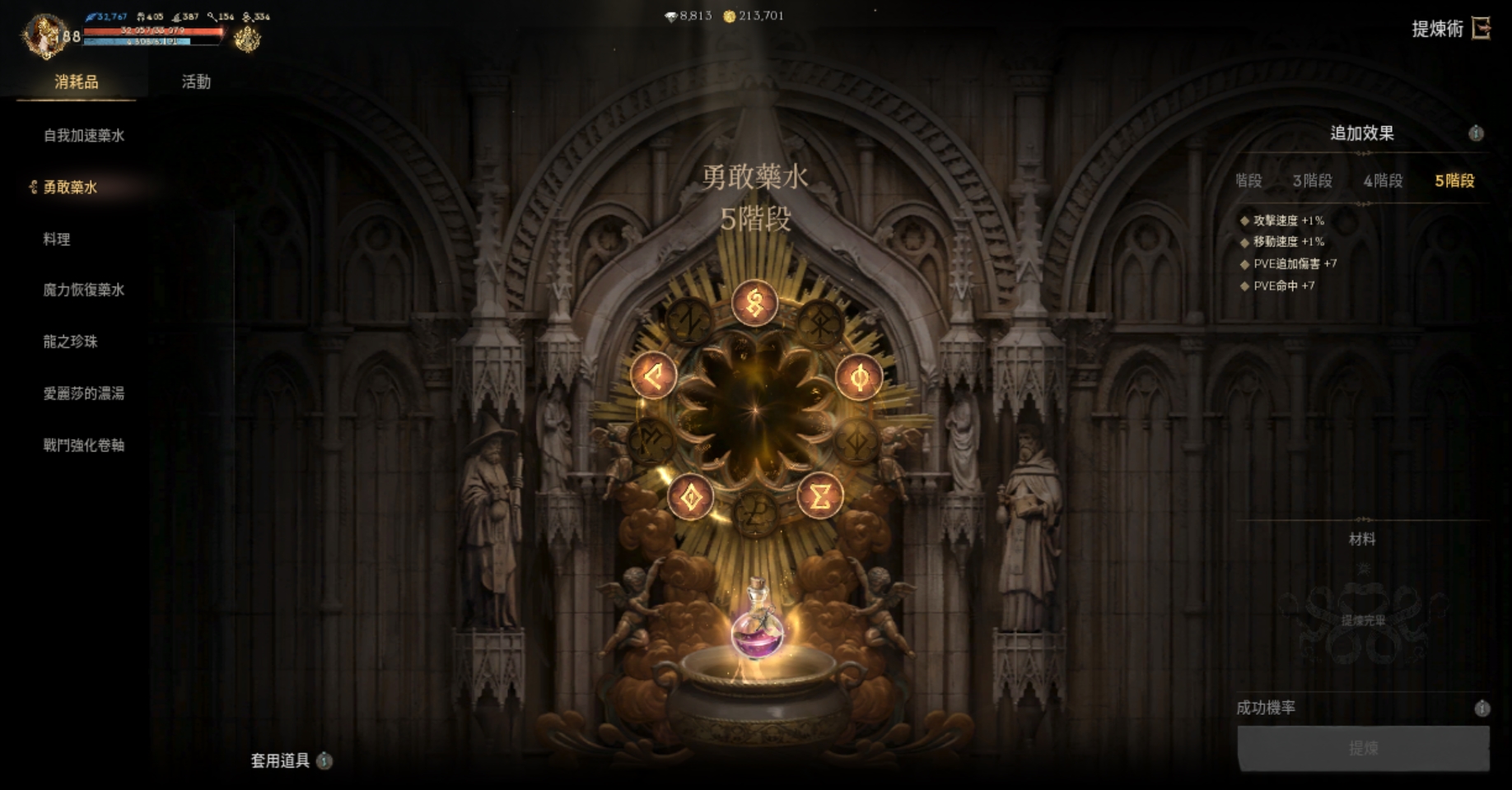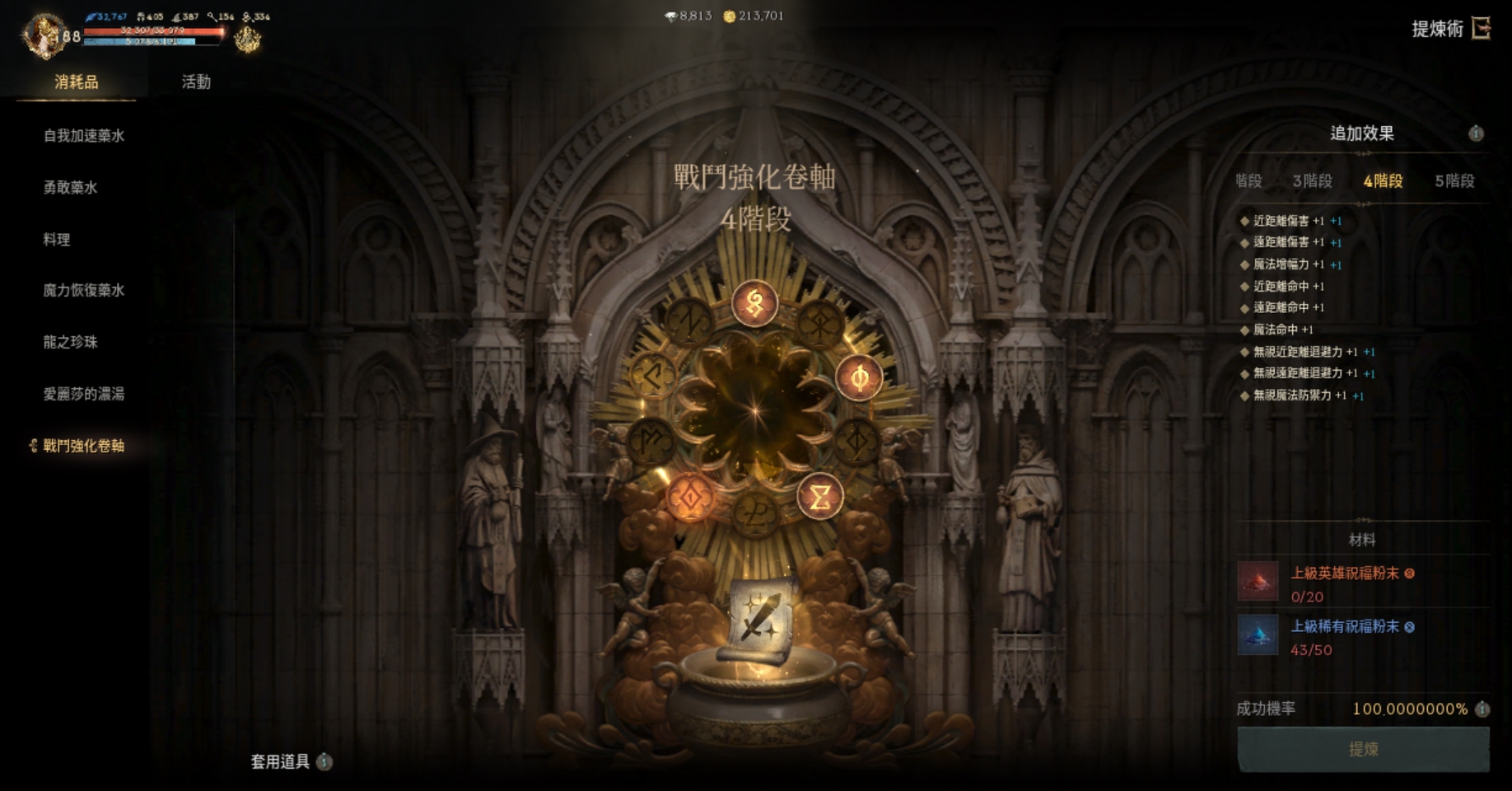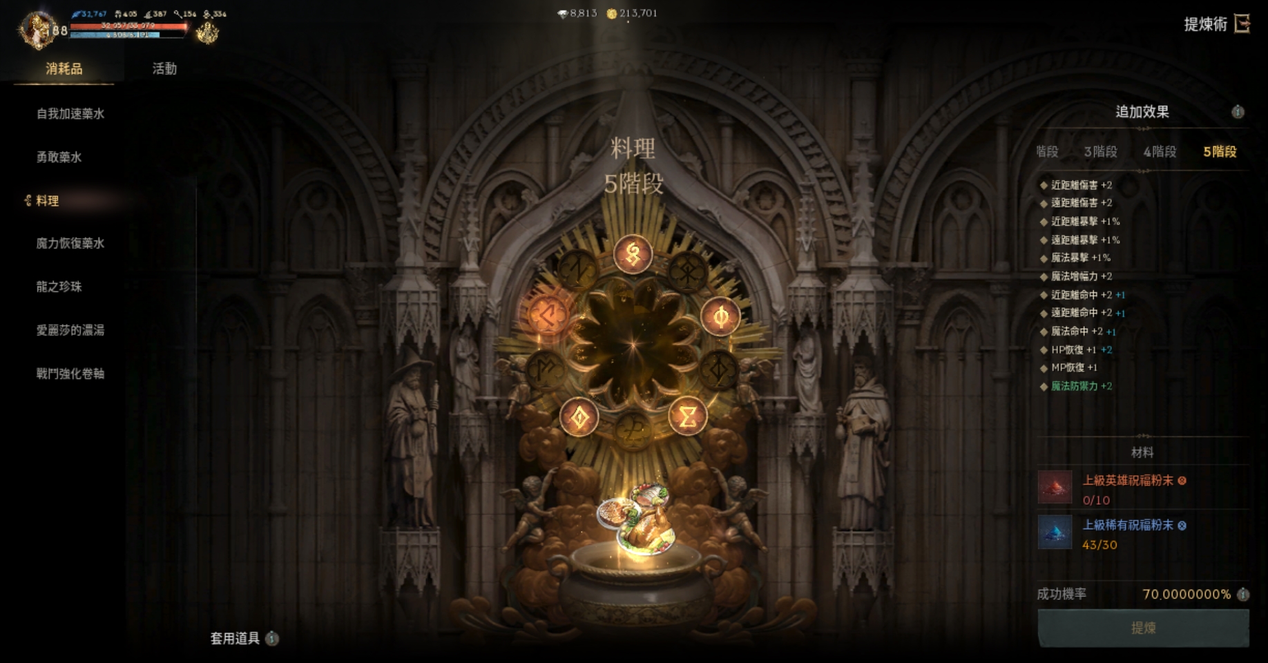 【提煉術】:加速4階、勇水5階、料理4階、魔力4階、龍珠4階、濃湯1階、戰鬥捲3階