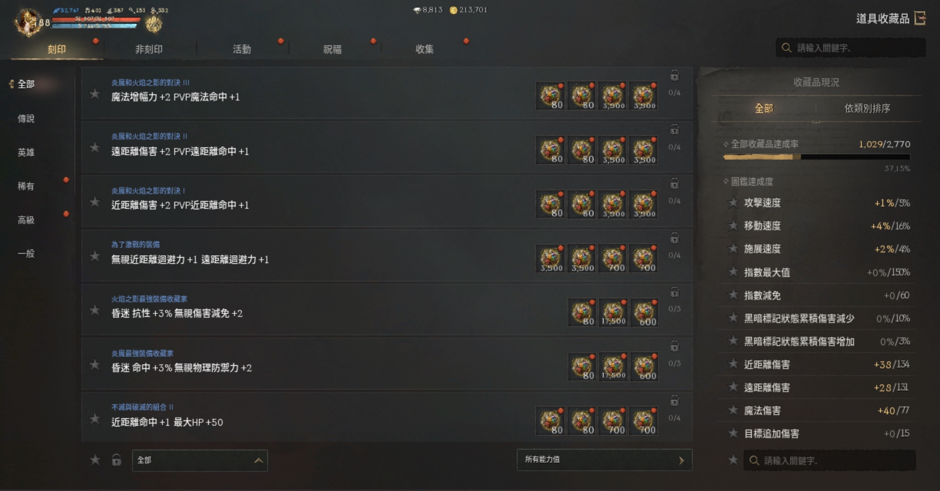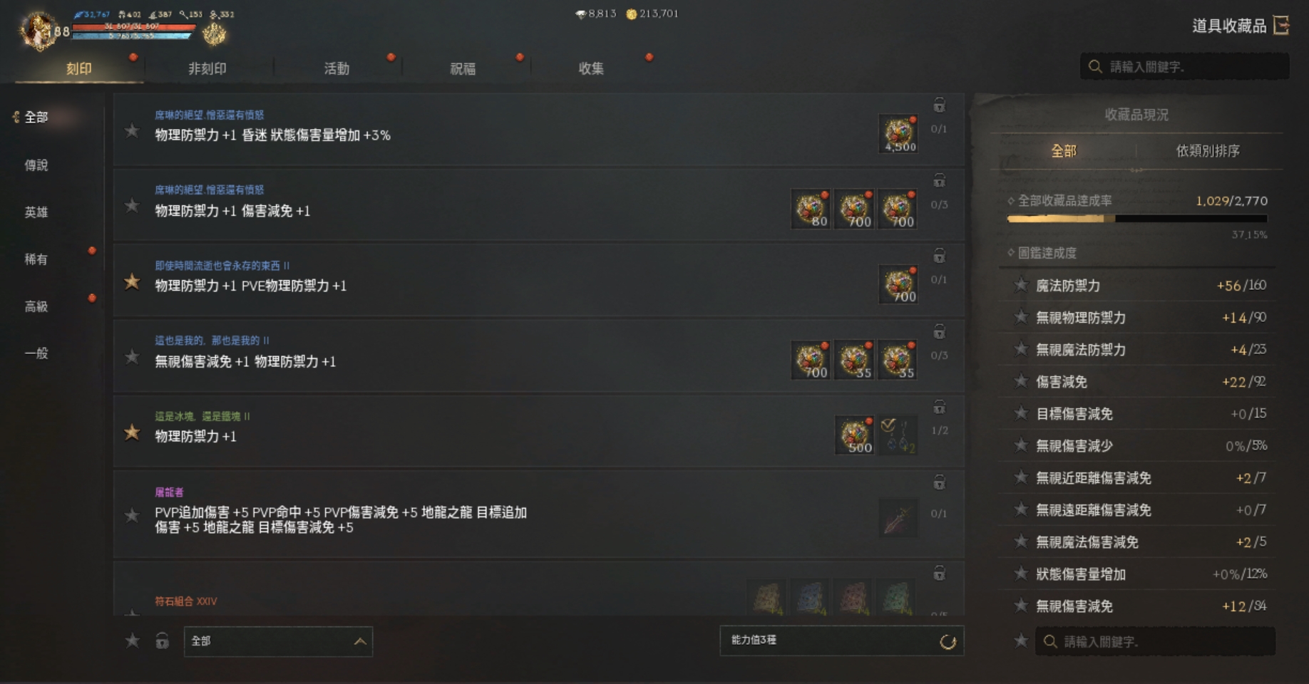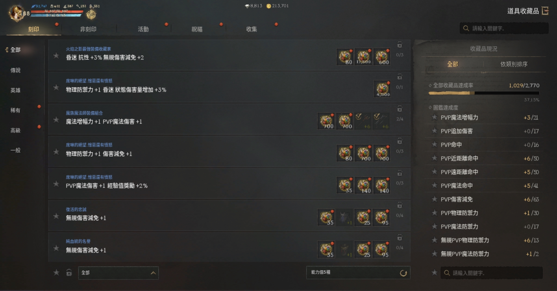 【刻印紅裝】:)+3祝裂痕耳、+8天使仗、+2血戒.+6噩夢守護戒指.+6祝福噩夢勇士戒指.+6冰節頭盔.+5匠人脛甲+5冰節手套