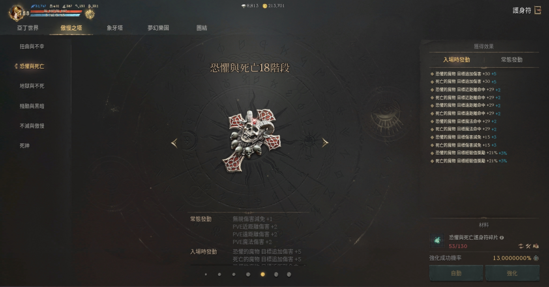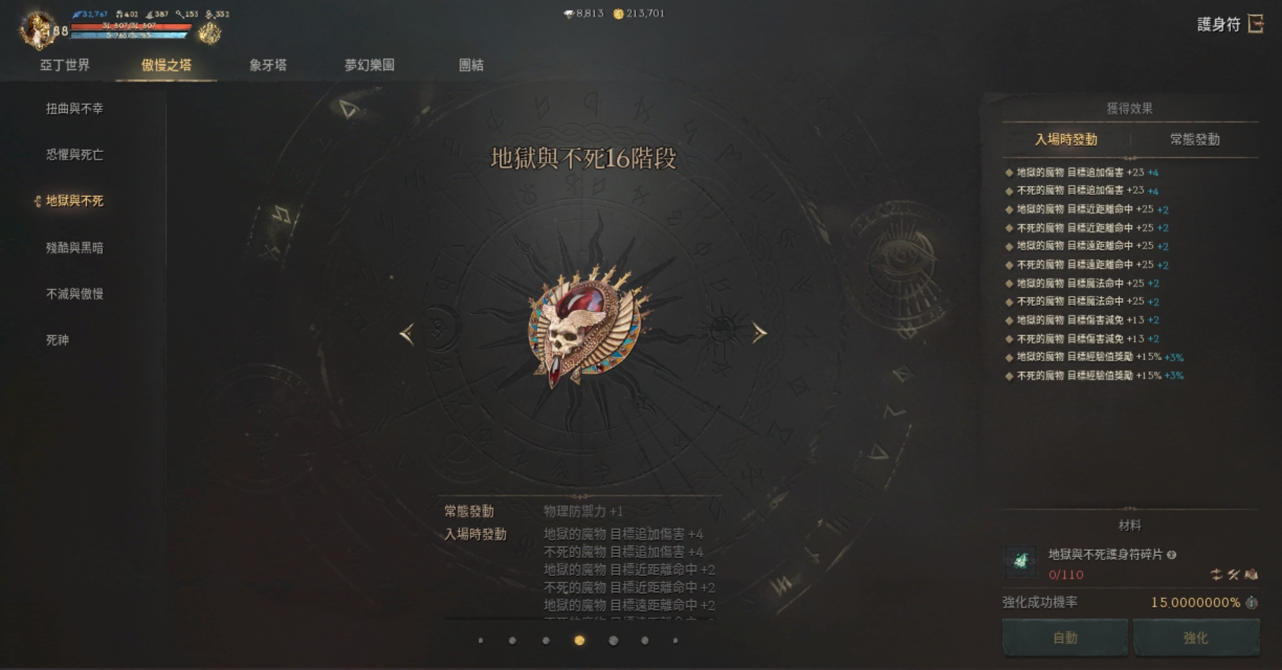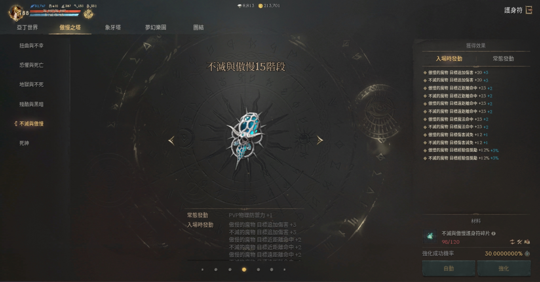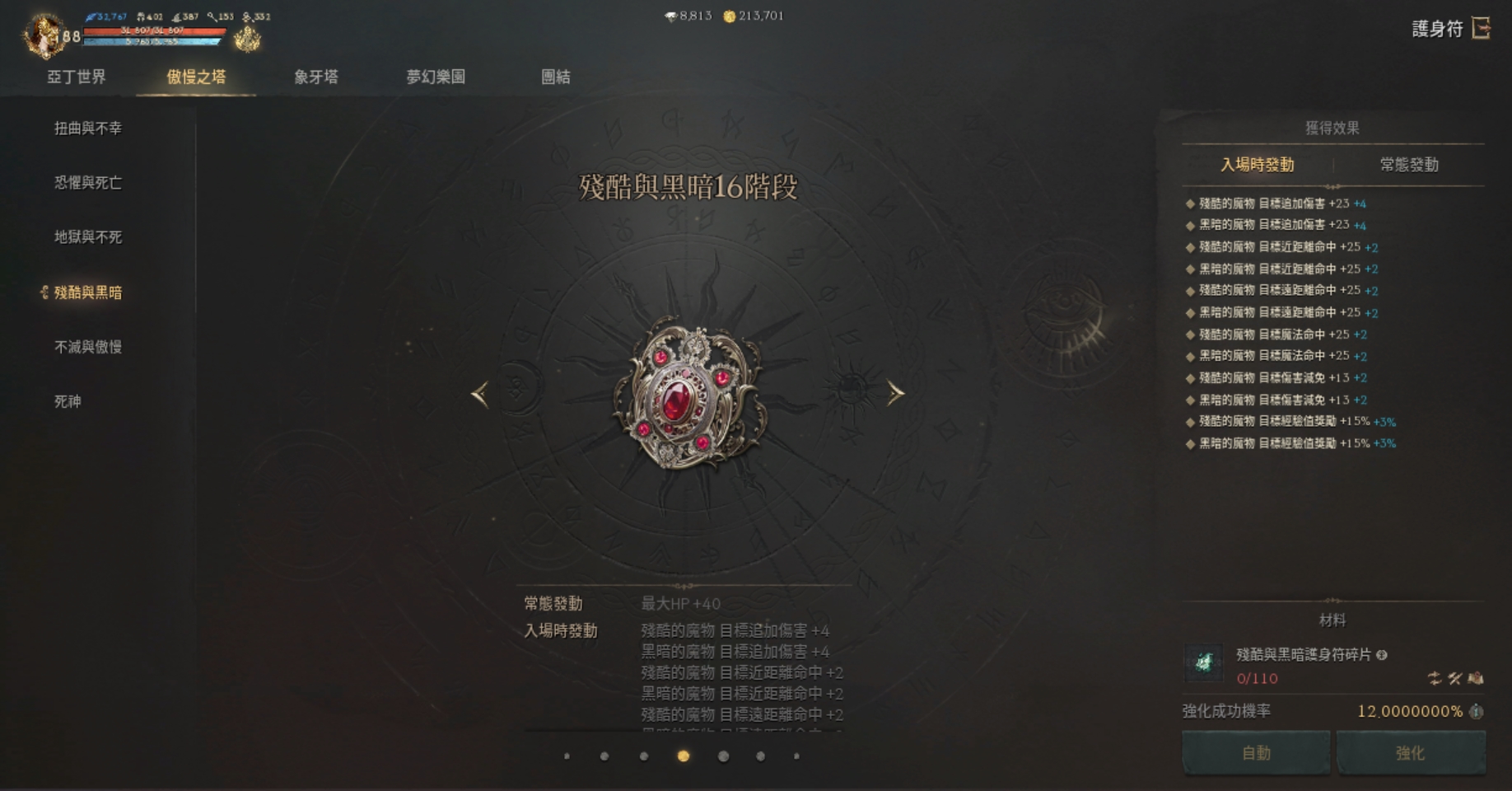 亞丁世界(17階)、扭曲不幸(17階)、恐懼死亡(17階)、地獄不死(15階)、殘酷黑暗(15階)、不滅傲慢(14階)、死神(0階)、象牙塔(18階)、夢幻樂團(13階)、活動團結(0階)
