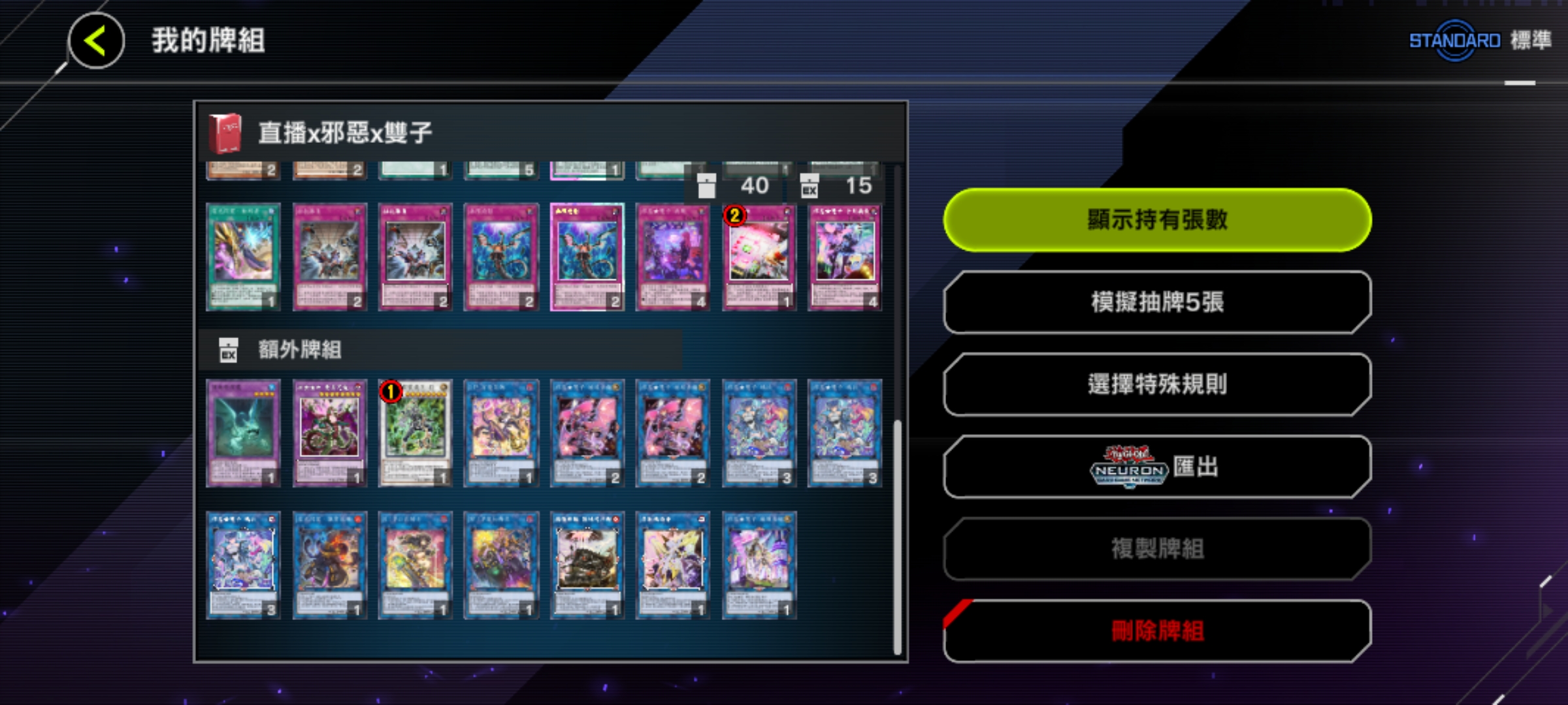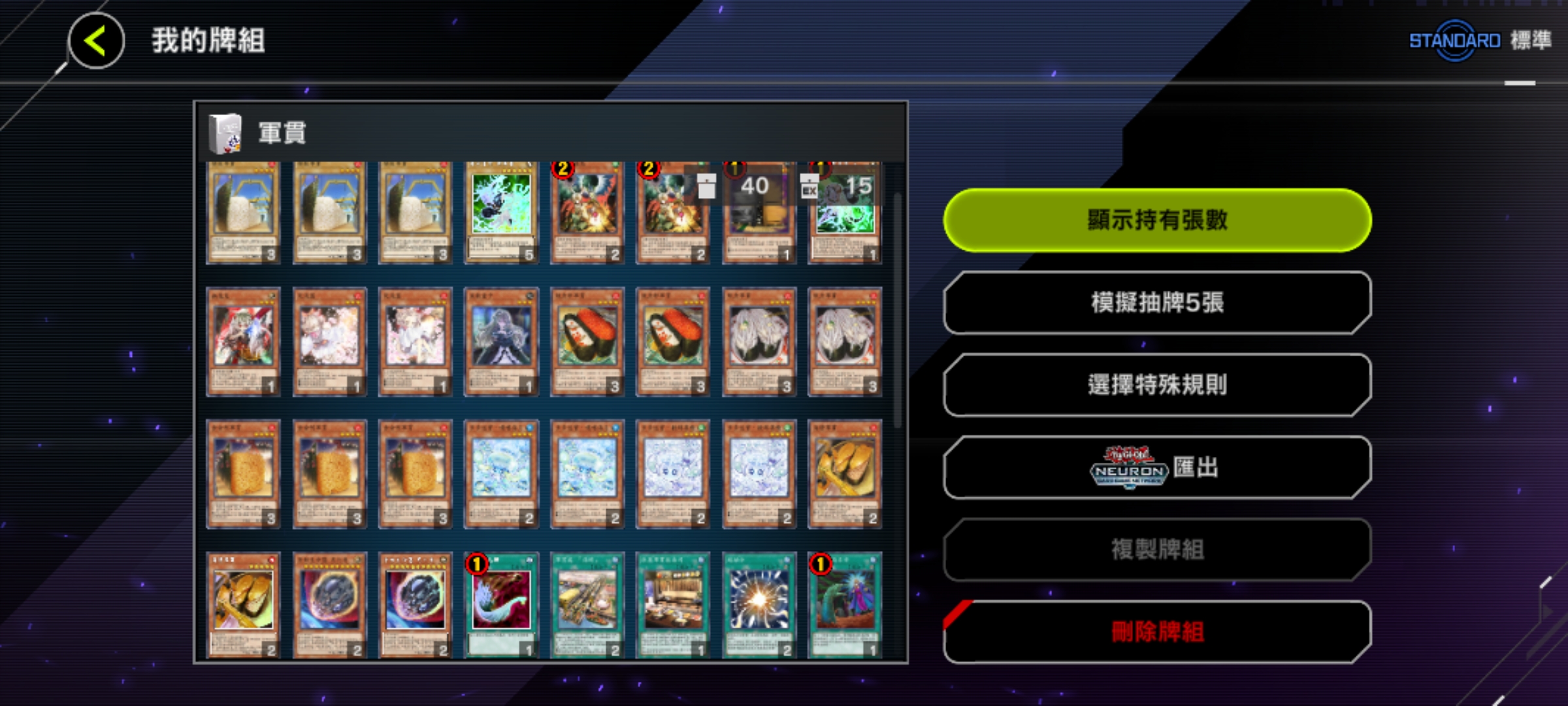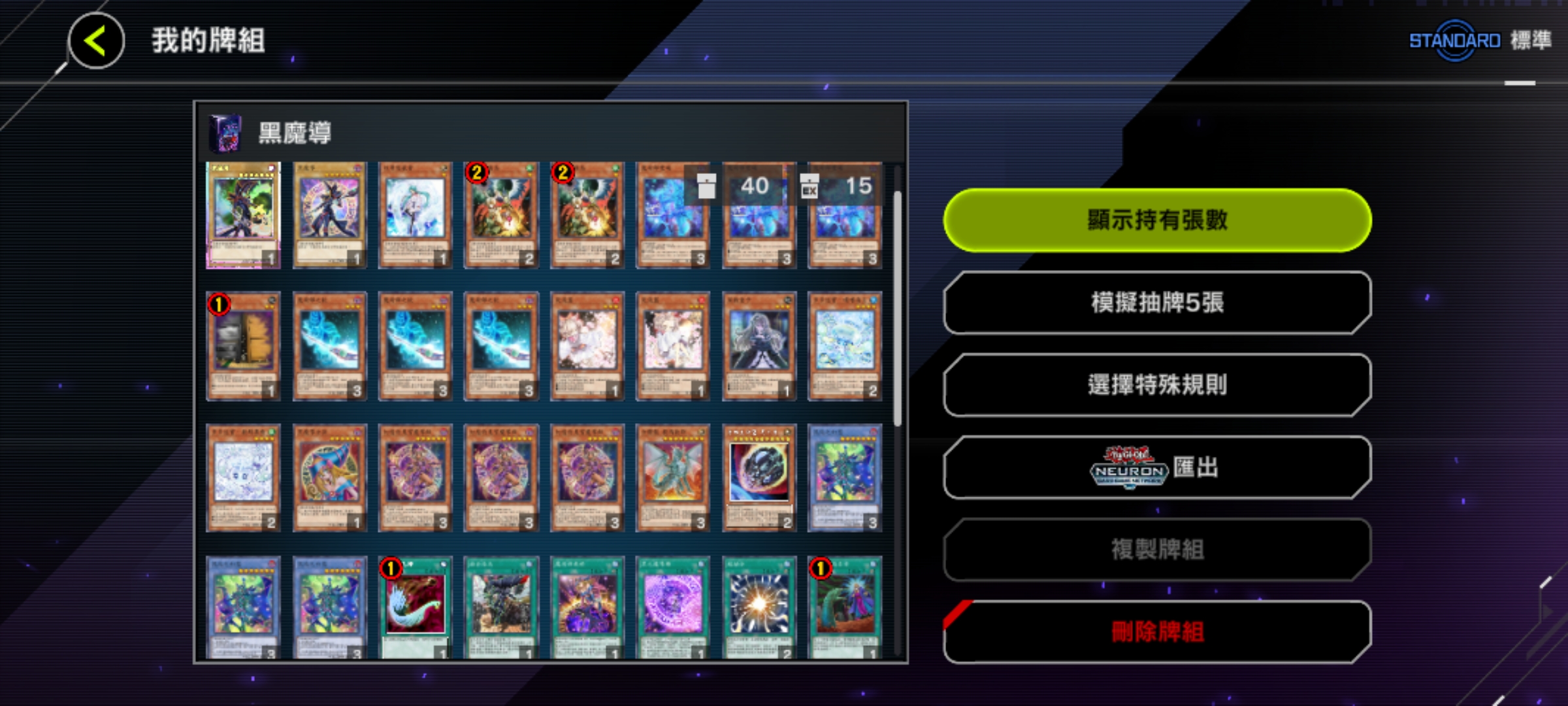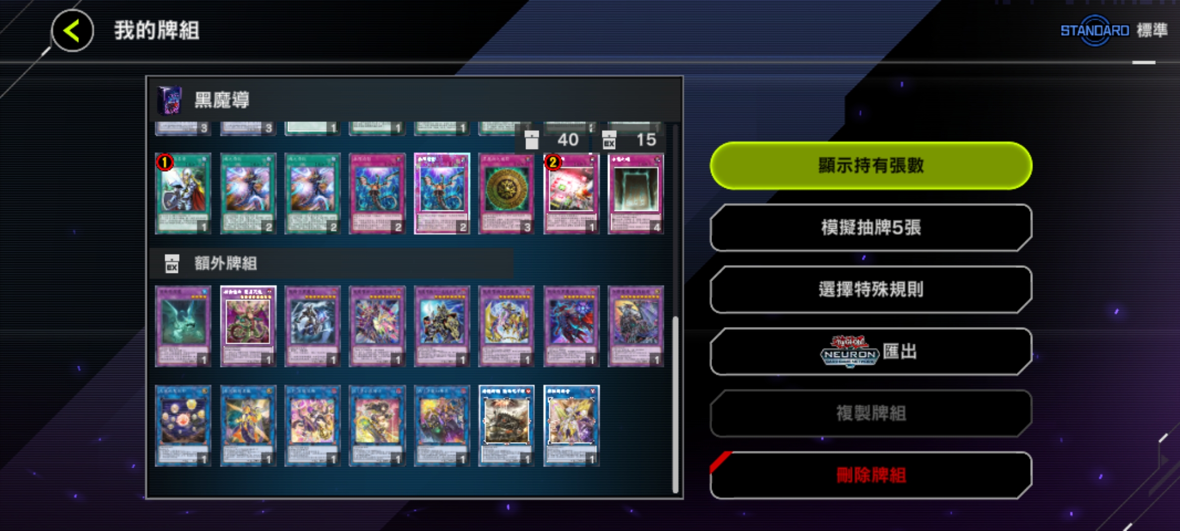 魔法卡:神鷹羽毛掃、冥王結界波、墓穴的指名者(速攻)、抹殺的指名者(速攻)、閃電風暴、禁忌的一滴(速攻)、黑之魔導陣(異圖版!)。