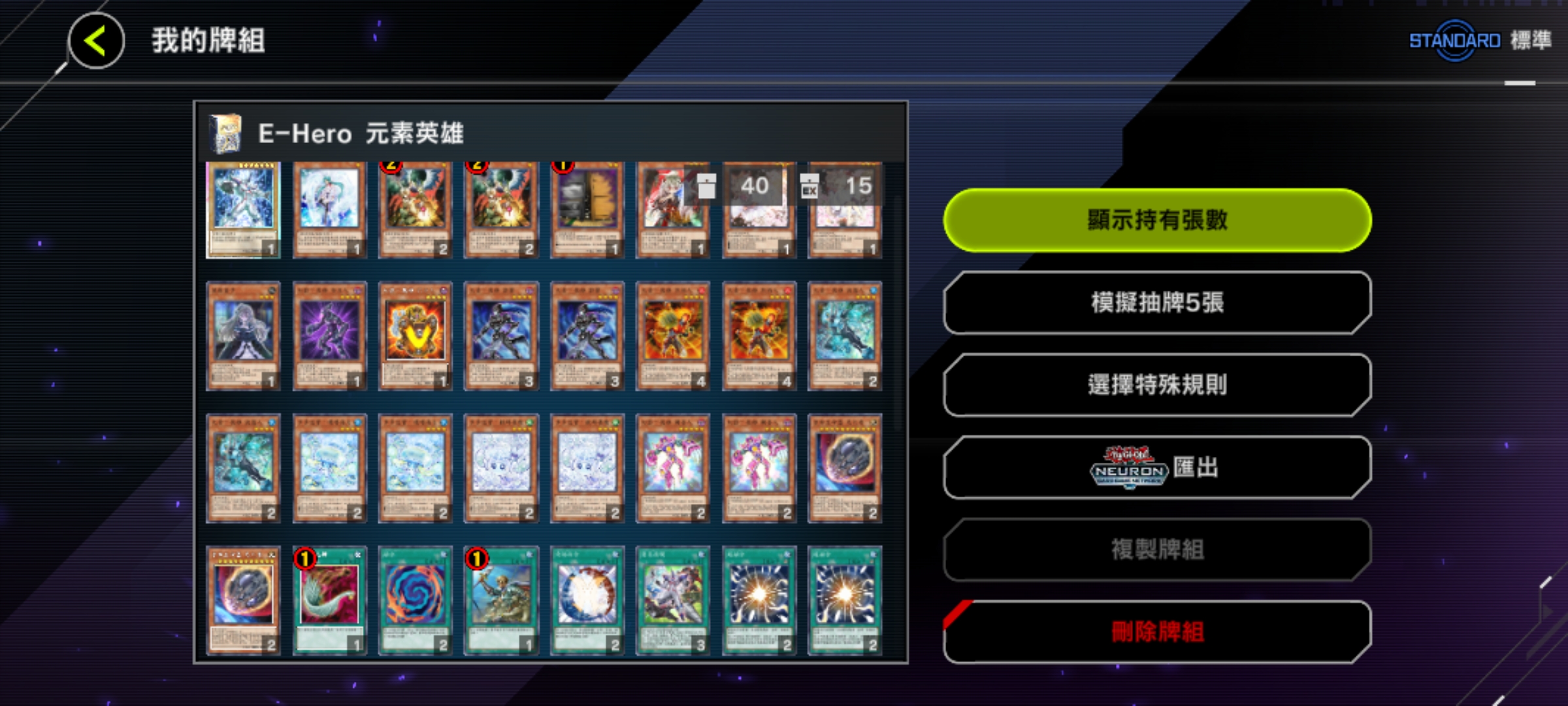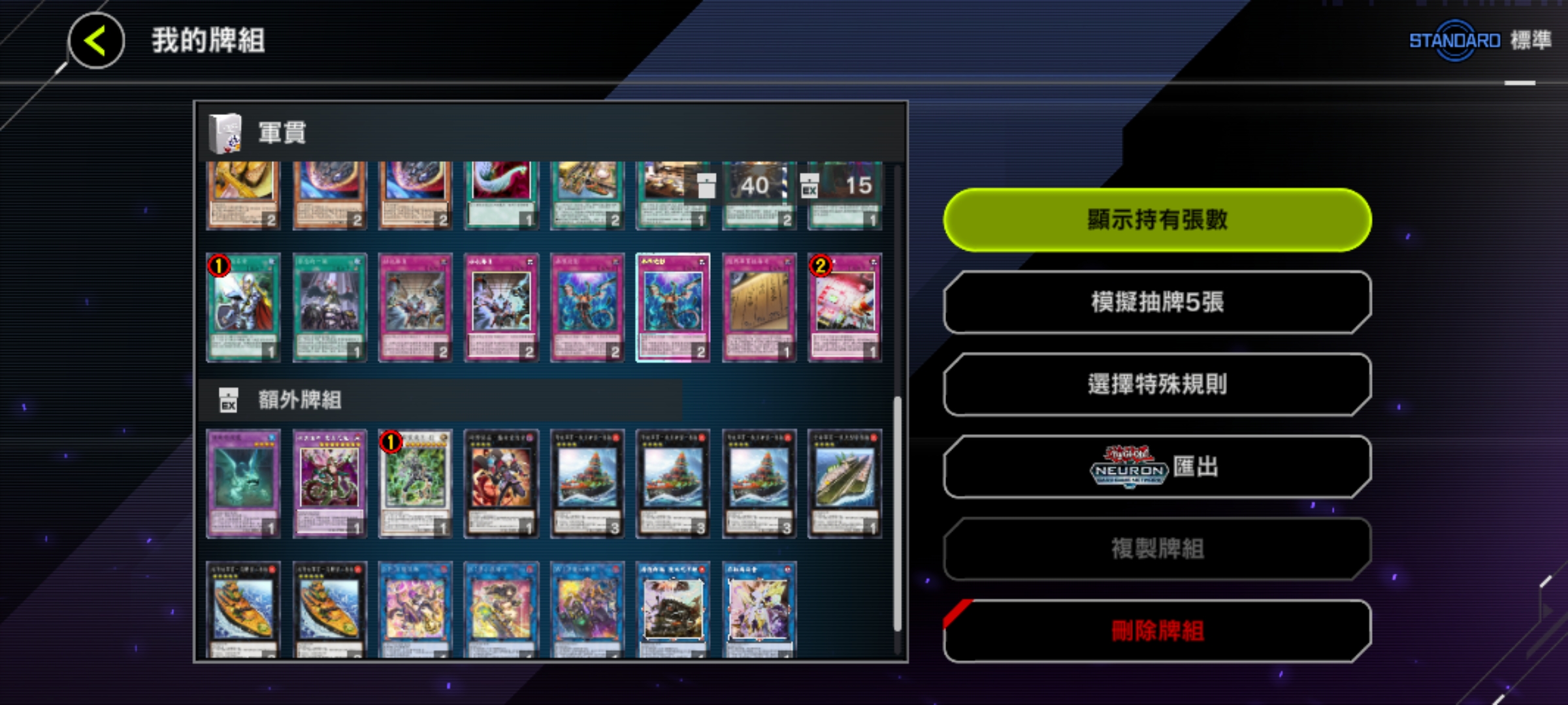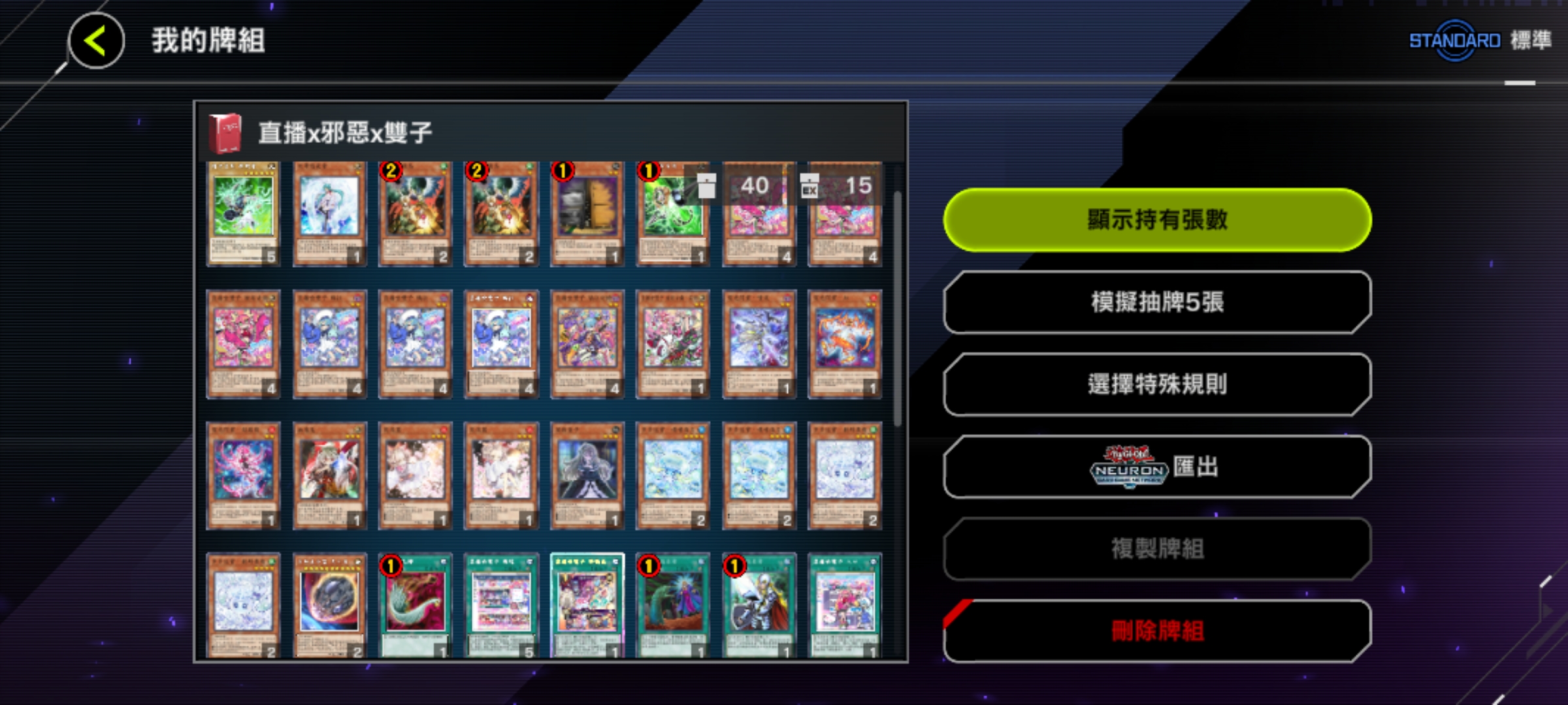 魔法卡:神鷹羽毛掃、冥王結界波、墓穴的指名者(速攻)、抹殺的指名者(速攻)、閃電風暴、禁忌的一滴(速攻)、黑之魔導陣(異圖版!)。