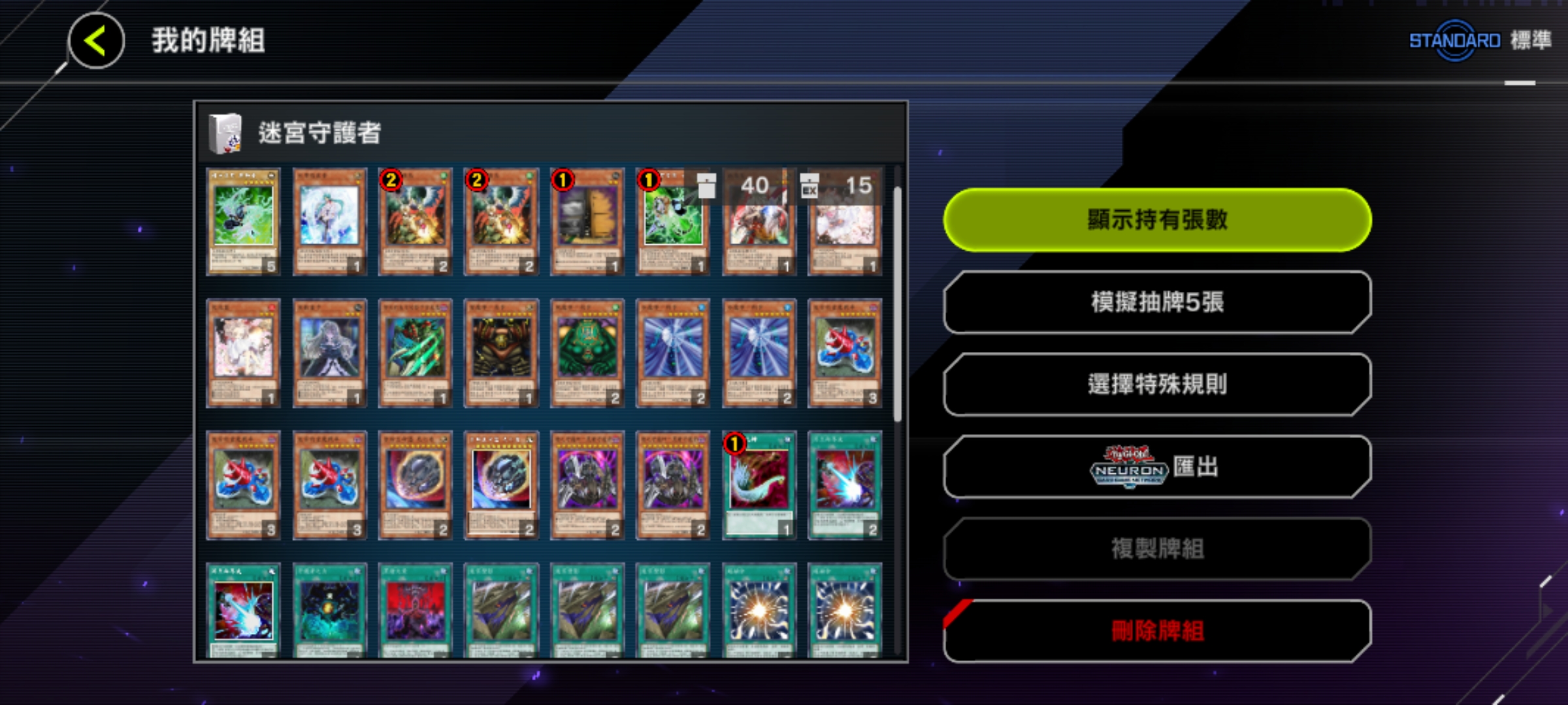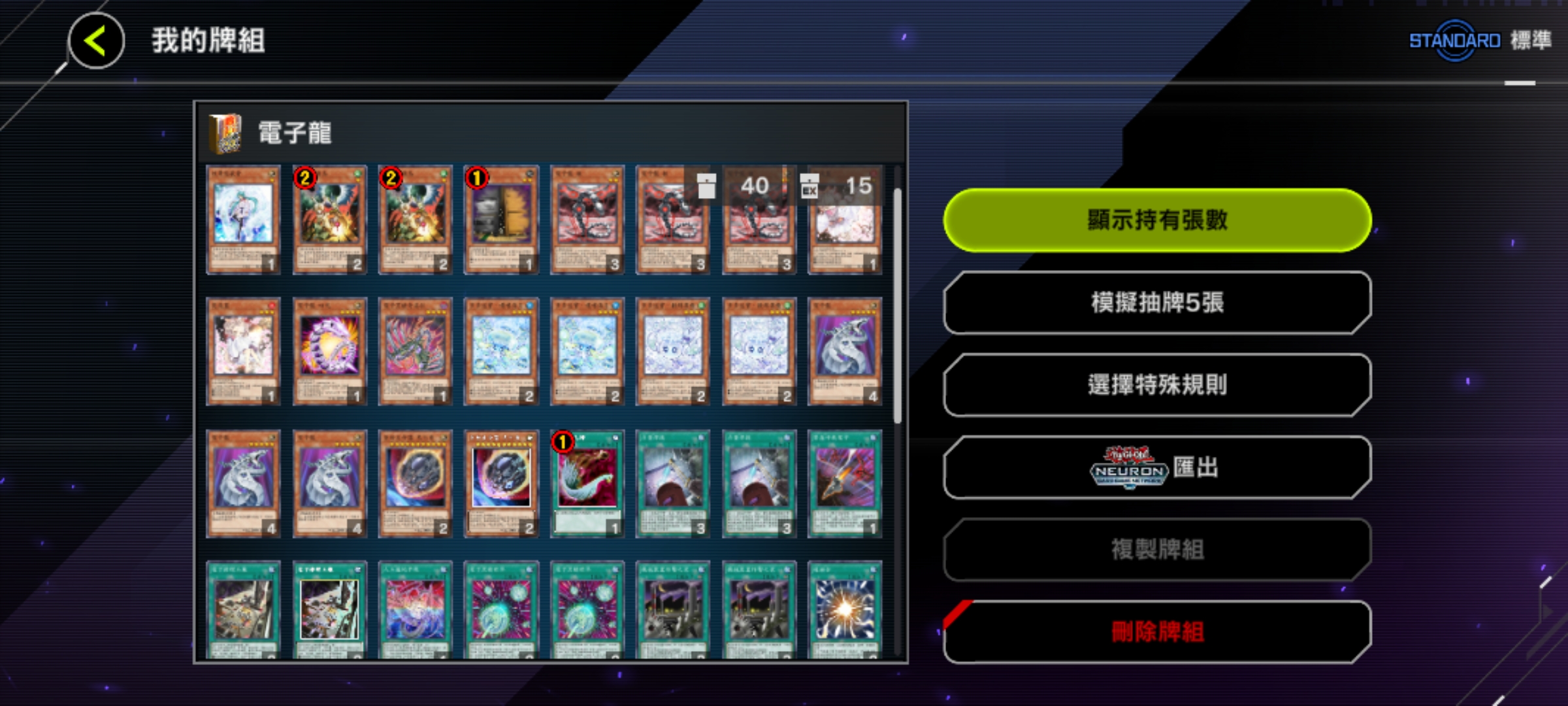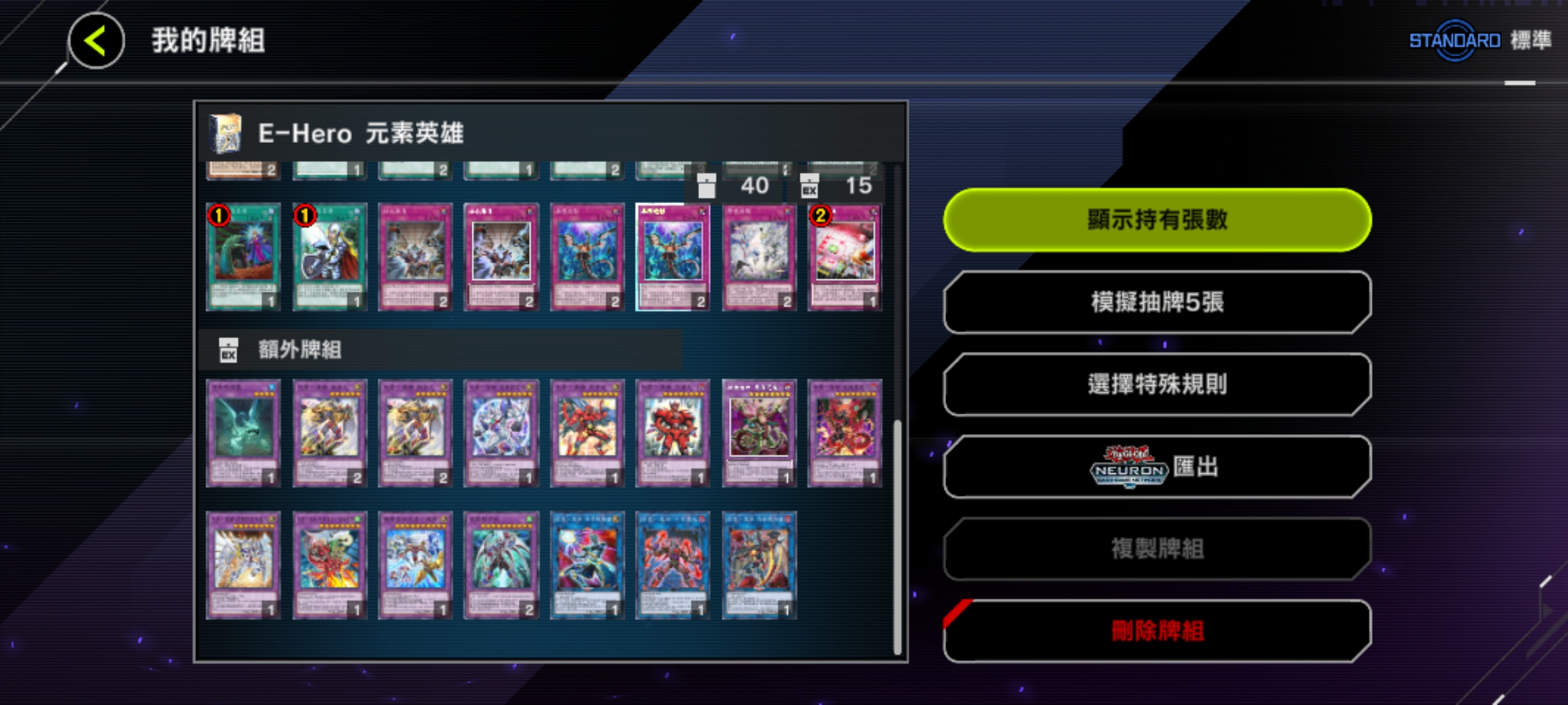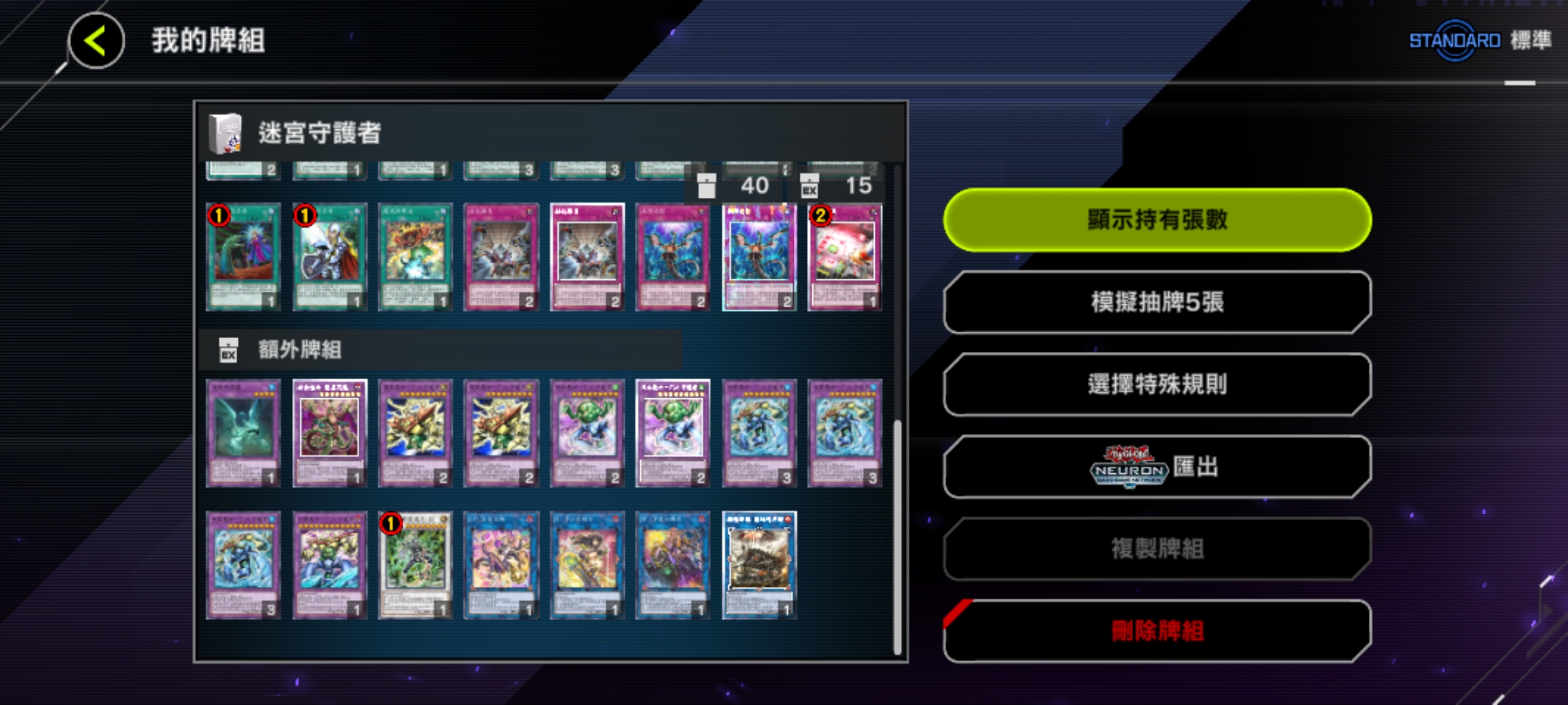 魔法卡:神鷹羽毛掃、冥王結界波、墓穴的指名者(速攻)、抹殺的指名者(速攻)、閃電風暴、禁忌的一滴(速攻)、黑之魔導陣(異圖版!)。