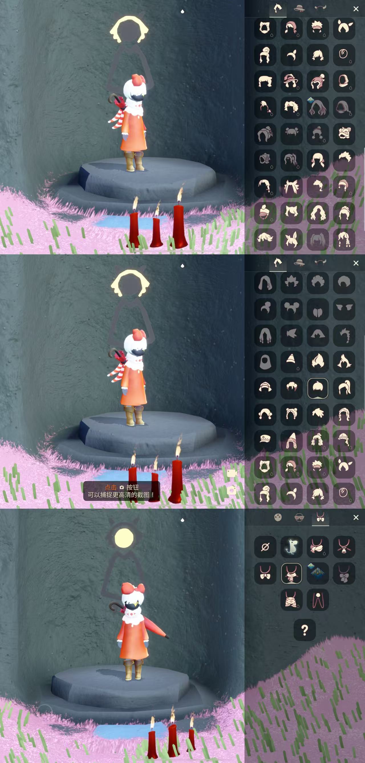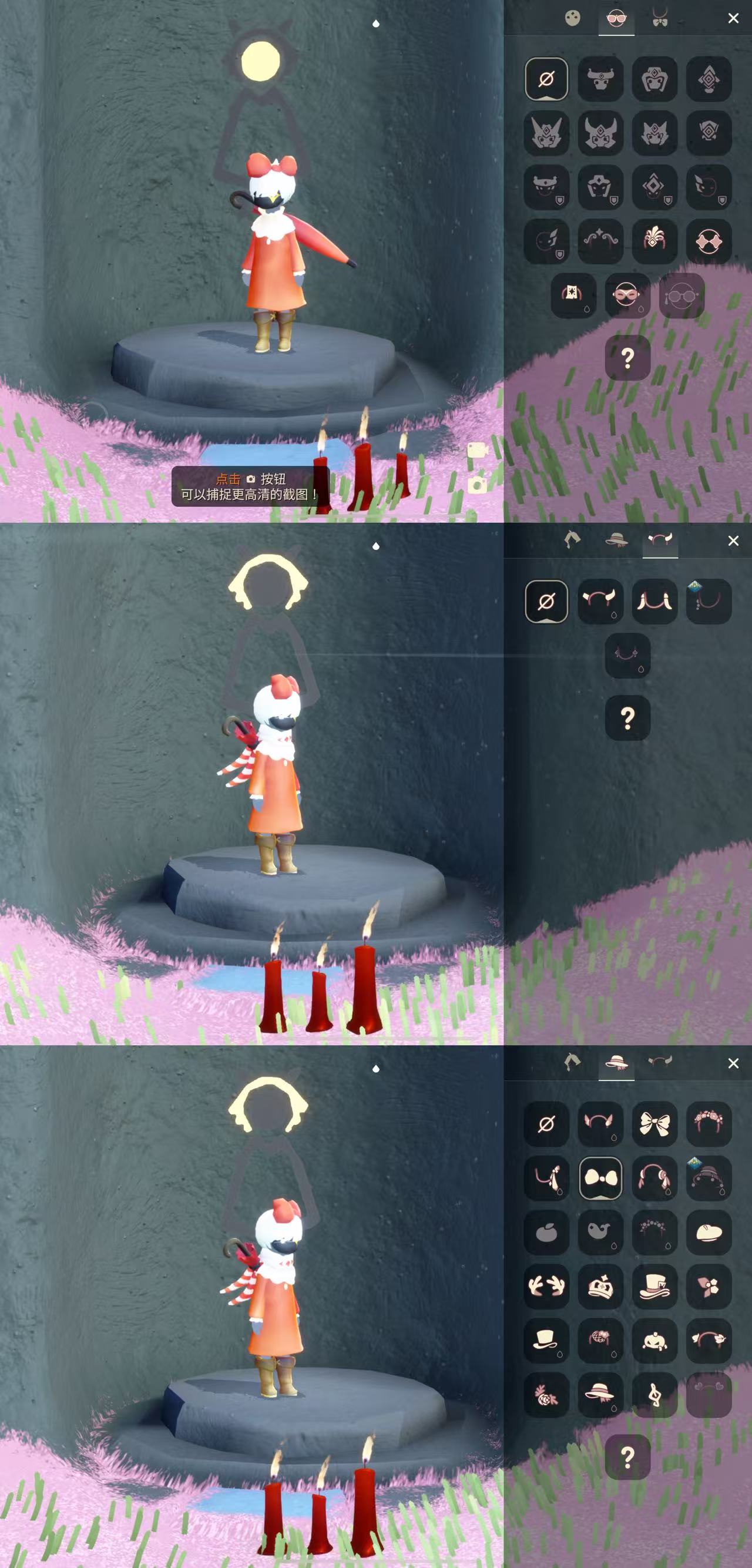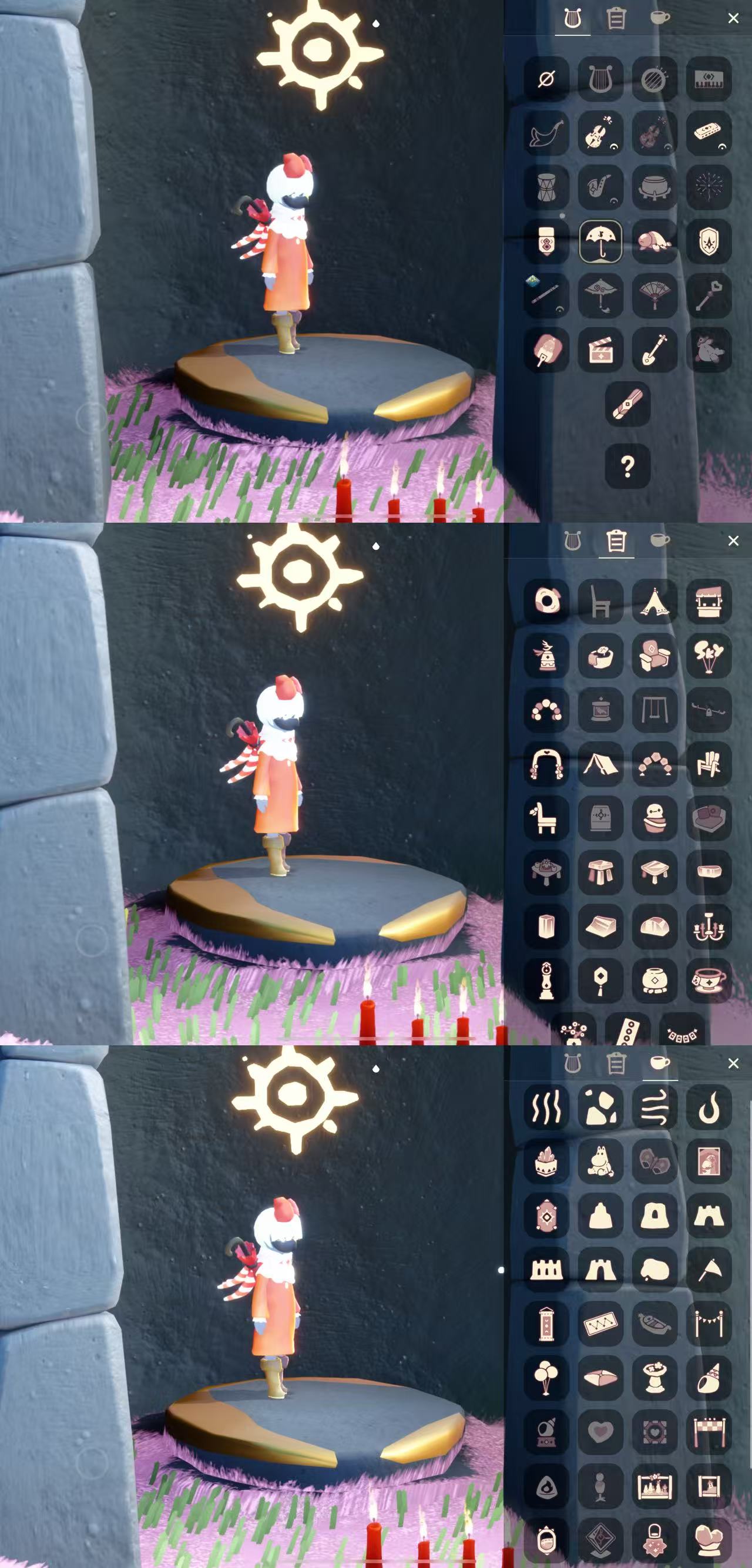 物品:紅色姆明大傘 姆明玩偶 妮妮紅裙 姆明圍巾 手套鬥篷 黃色蝴蝶結 正太 虛榮 星星面具 正步冒險家面具 歐若拉褲子 姚坤發型 貓貓頭 軍帽 高馬尾 爆炸雨媽 獅子頭 爆炸頭 魔術帽 透明褲子僵屍貼歐若拉褲子 姆明季節褲子 鈴鐺項鏈 聖誕椅子 滑雪板 兔子面具 龍面具 老虎面具 舞獅褲子 鐵鏟 小王子擊劍褲 海洋武士褲 海洋發夾 歐若拉面具 玫瑰面具 玫瑰發型 瘋帽匠發型等 櫻花 虛榮 軍帽 單邊羽毛 紅色蝴蝶結, 海洋武士褲 工裝背帶褲 六周年褲子 六周年小皇冠 燕尾服 大提琴 等……(還有很多物品沒標出來看下方圖片)