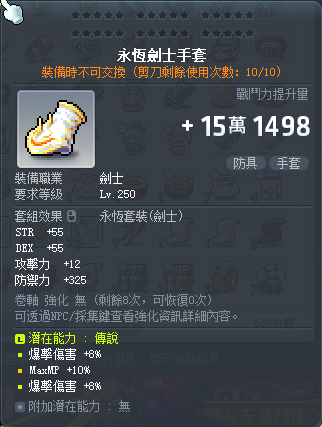 道具 【永恆劍士手套】 雙爆永恆劍士手套 / 250劍士裝 / 16%爆傷 / 小資用 / 打王用 /蓮