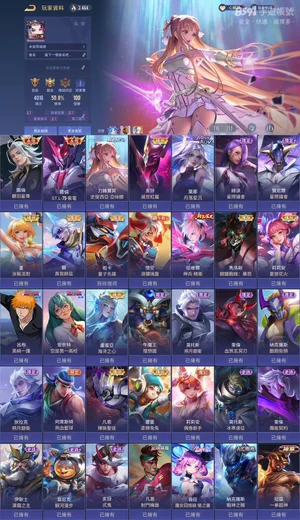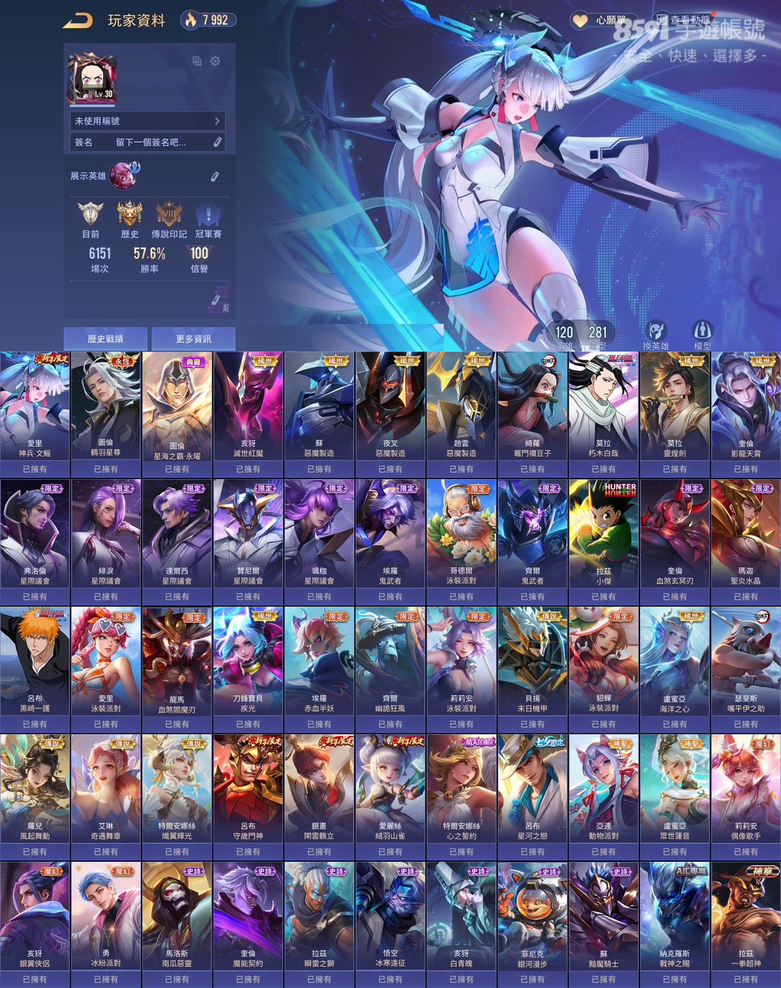 勝率佳!近全英雄近三百造型!共120英雄281造型!勝率近58%!!共8次S傳說戰場印記!!常用奧義皆已齊全!!