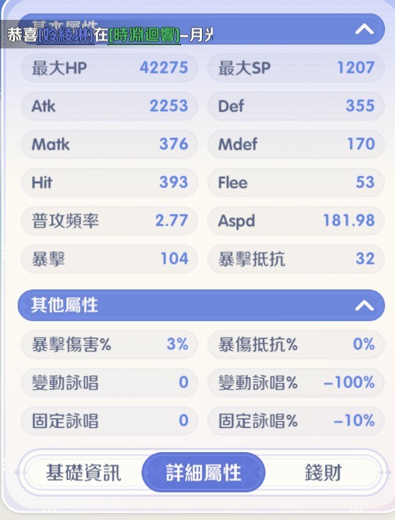 秒傷精煉如圖 特技還有兩紫 在考慮要走銳射還鳥獵 等官方這周更新 如果都洗成金 應該能20