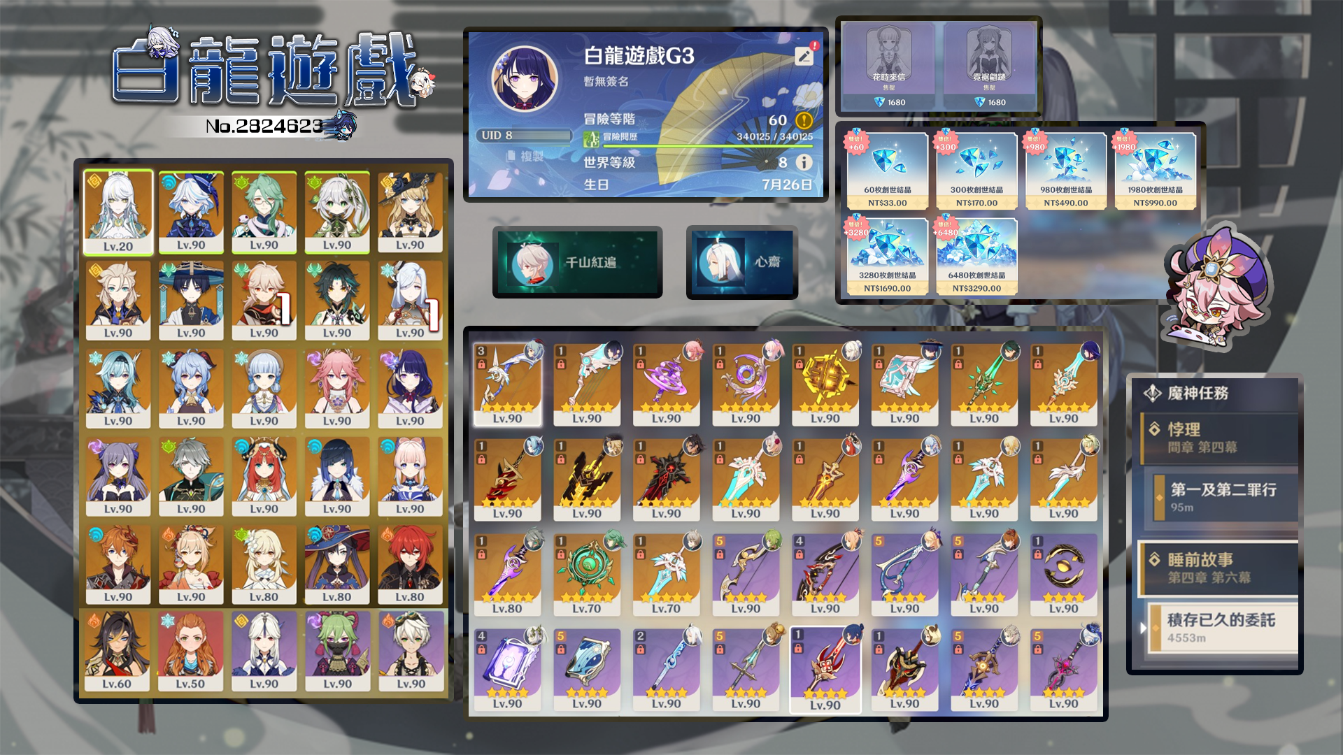 帳號 【女、60等、26金角、19金武】 G3 茲白、水神、白术、草神、妮露、夜蘭、娜維婭、申鶴、雷神、優菈、八重、宵宮