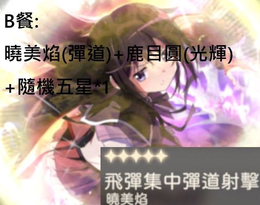 | B | 曉美焰(彈道)+隨機五星 | 60 |