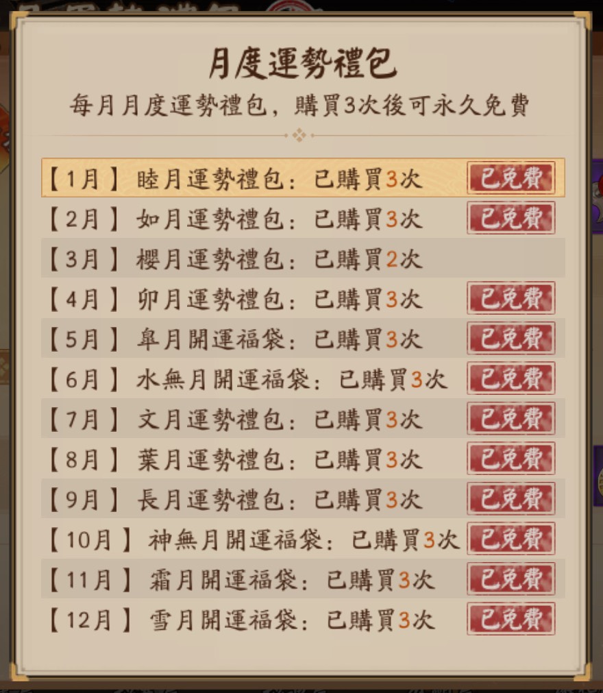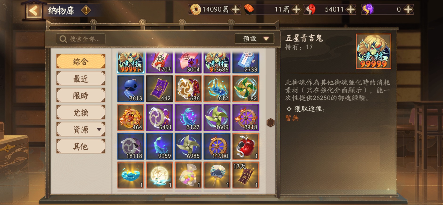 5. 其餘:11萬體力、大量御靈 & 覺醒材料 & 勳章、每月免費月卡(可領 600 勾玉)共11個月(連續買月卡滿三年)、五星鬼武達摩、黑蛋 12 個、幾乎所有式神技能皆滿級,少數有多號機(ex. 天照二號機、須佐三號機)