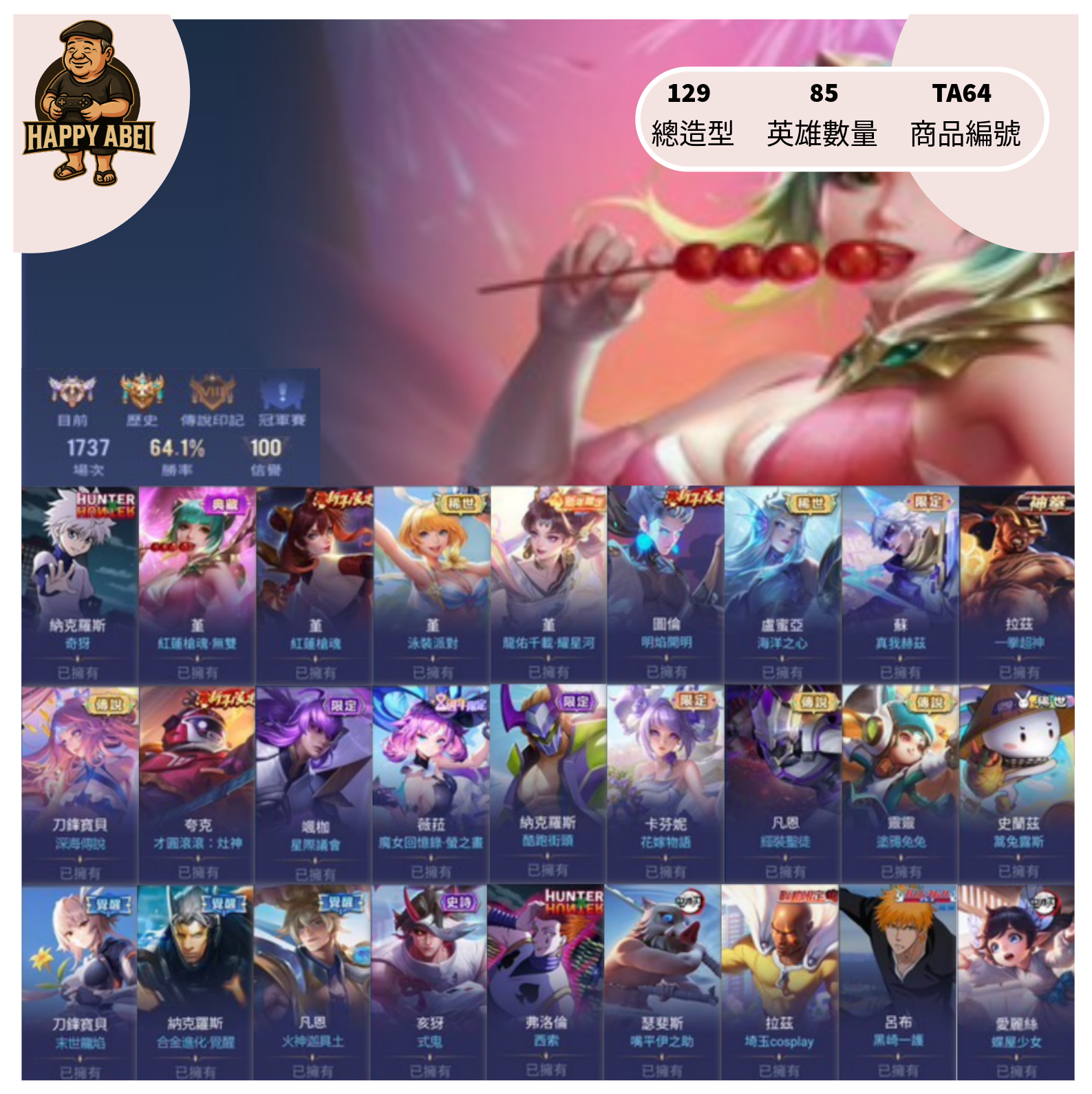 帳號 【Garena帳有綁定、青銅、無VIP、85英、129造】 [分期/直購]快樂阿北遊戲館~主打納克奇犽堇典藏新年泳裝拉茲一拳蘇真我星際議會薩