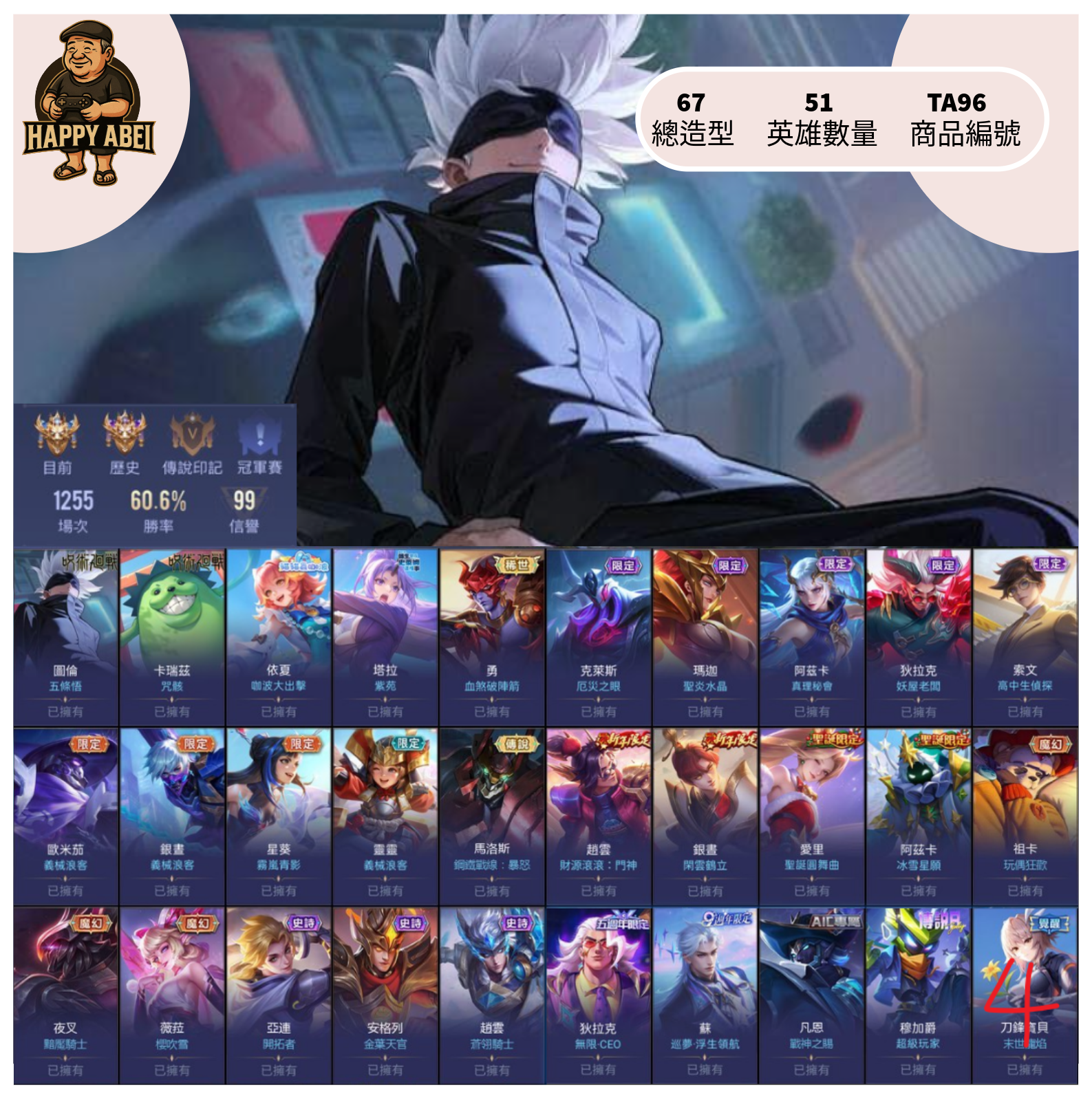 帳號 【Garena帳有綁定、青銅、無VIP、51英、67造】 [分期/直購]快樂阿北遊戲館~主打圖倫五條悟 刀鋒寶貝末世4級 咖波依夏