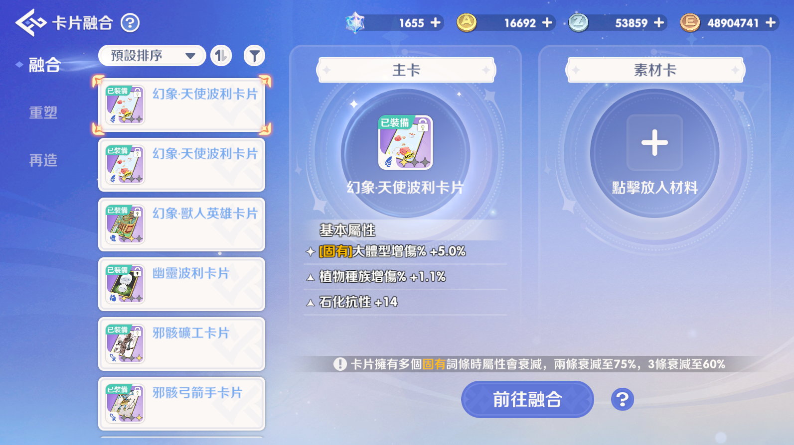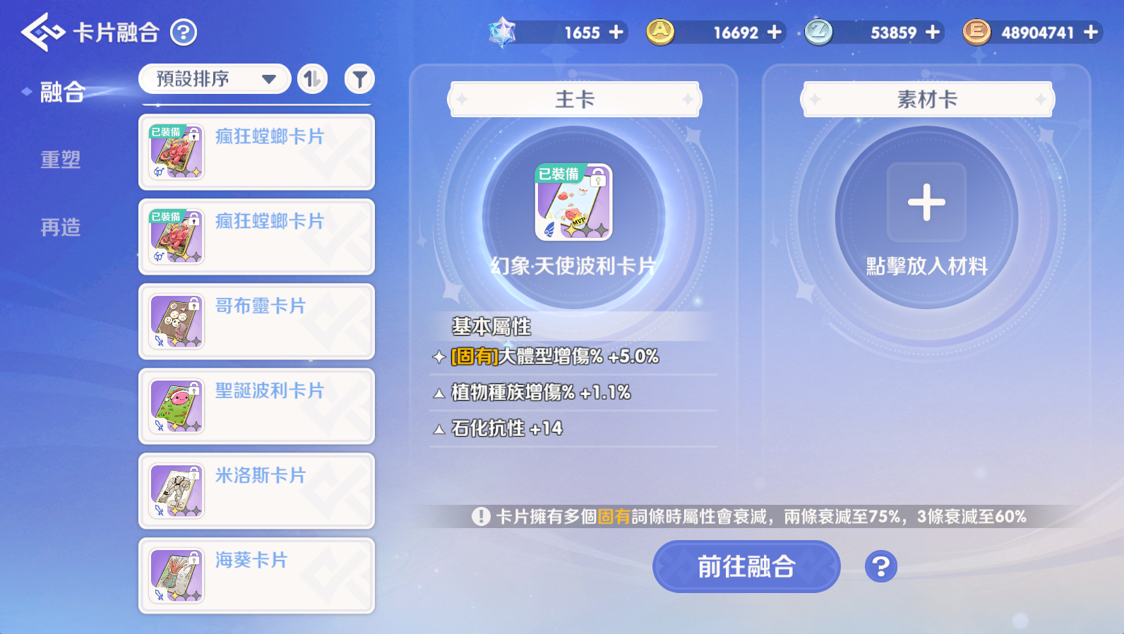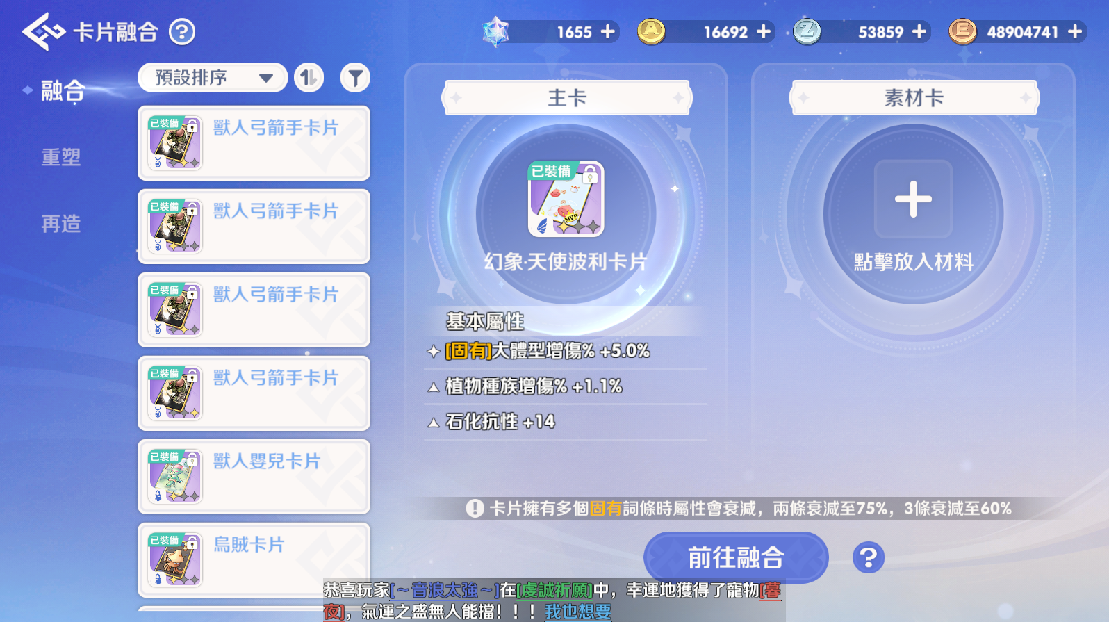 紫卡(其他用不到的都拿去塞典藏了):礦工卡*1、牛卡*1、獸弓卡*4、邪骸弓箭手*2、海葵卡*1、蜈蚣卡*1、幽波卡*1、獸嬰卡*1、狂暴螳螂*4等。