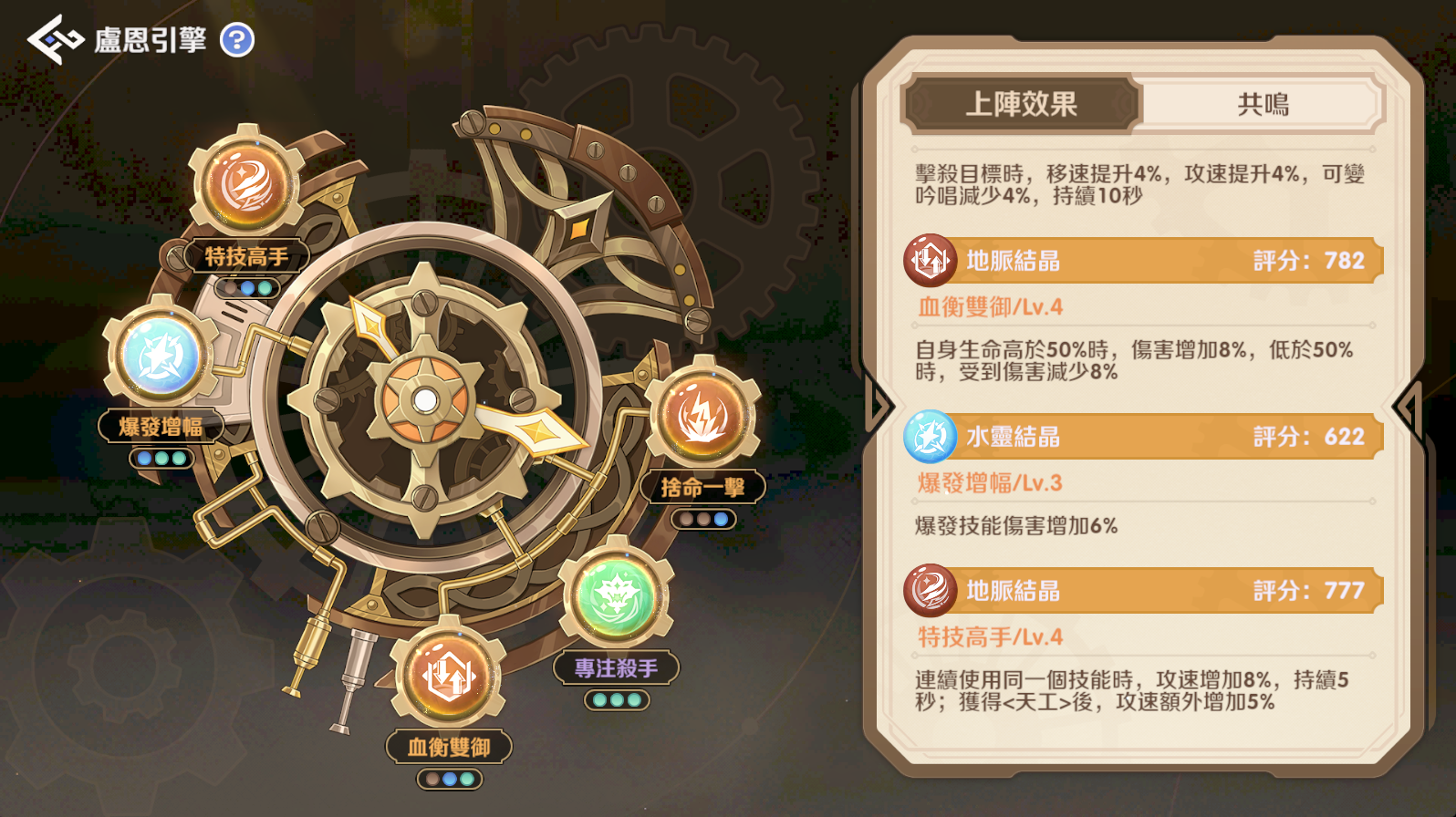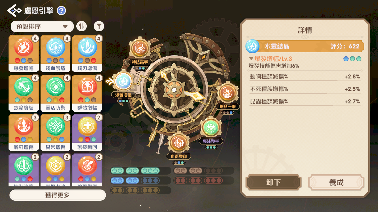 目前是7綠4藍,裝的是 特技高手lv4橙色、爆發增幅lv3橙色、捨命一擊lv3橙色、血衡雙禦lv4橙色