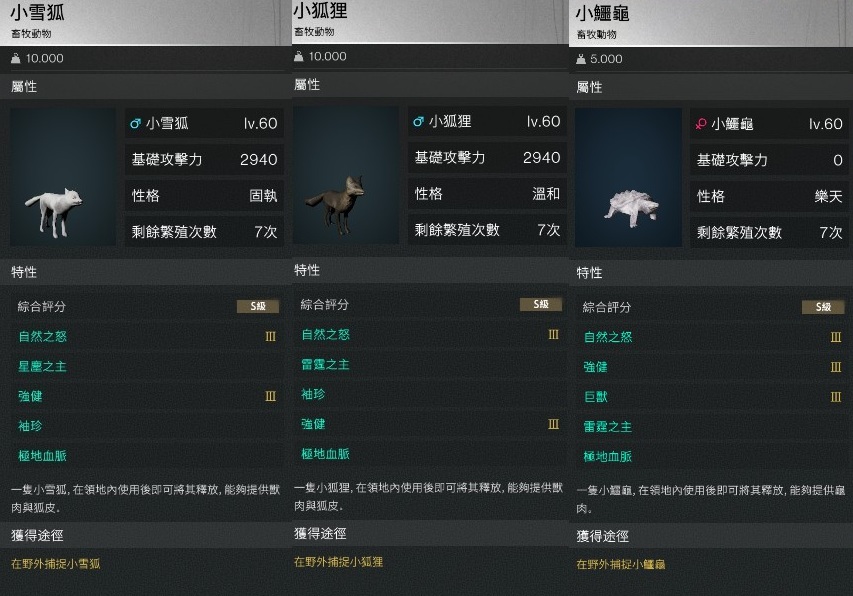改版後繁殖機制的新一代宰殺動物,培養較為困難需花費大量時間與精力,一對詞條一樣的 S 級動物,繁殖之後詞條 100% 一樣。