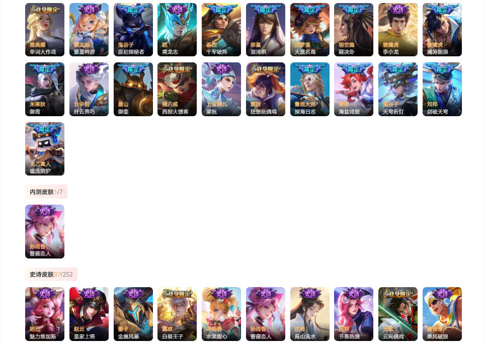 【限定皮肤54】 太乙真人谧流熔炉 西施雪境奇遇 周瑜熔金海岸 刘邦剑破天穹 鬼谷子天穹祈灯 鲁班大师探海日志 裴擒虎擒涛扼浪 孙尚香蔷薇恋人 桑启海盐诗旅 李元芳云中旅人 沈梦溪大漠名商 兰陵王金庭之子 达摩沙漠行僧 庄周高山流水 上官婉儿梁祝 孙悟空孙行者 苏烈千军破阵 老夫子航海奇遇记 墨子神迹守卫 韩信逐梦之影 钟馗驱傩正仪 程咬金演武夺筹 元歌云间偶戏 狄仁杰万华元夜 亚瑟潮玩骑士王 孙悟空零号赤焰 雅典娜单词大作战 蒙犽狂想玩偶喵 云中君纤云弄巧 裴擒虎李小龙 狄仁杰魔术师 鬼谷子原初探秘者 马可波罗暗影游猎 猪八戒西部大镖客 蔡文姬繁星吟游 赵云皇家上将 老夫子醍醐杖 明世隐疑决卦 狄仁杰阴阳师 弈星混沌棋 夏侯惇朔风刀 盾山御銮 牛魔御旌 嬴政白昼王子 吕布猎兽之王 项羽海滩派对 铠青龙志 米莱狄御霄 典韦穷奇 白起狰 虞姬凯尔特女王 孙膑妖精王 庄周蜃楼王 苏烈春野闲踪