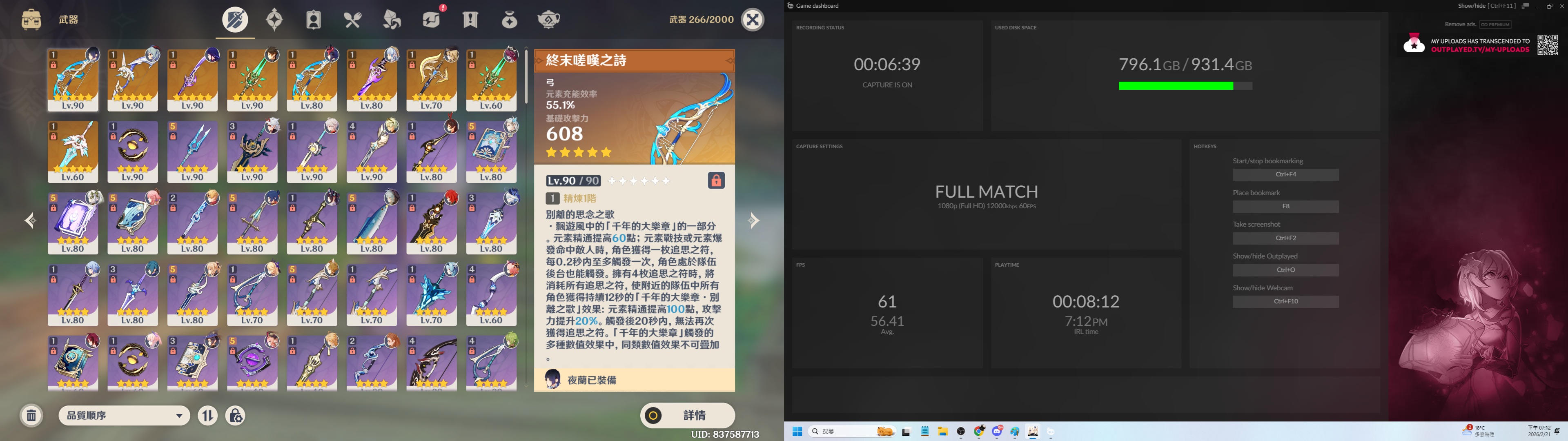 【男、59等、37金角、9金武】 雷電將軍2命專武 夜闌一命專武水龍王2命 水神 萬葉 綾人 納西妲 鍾離 綾華