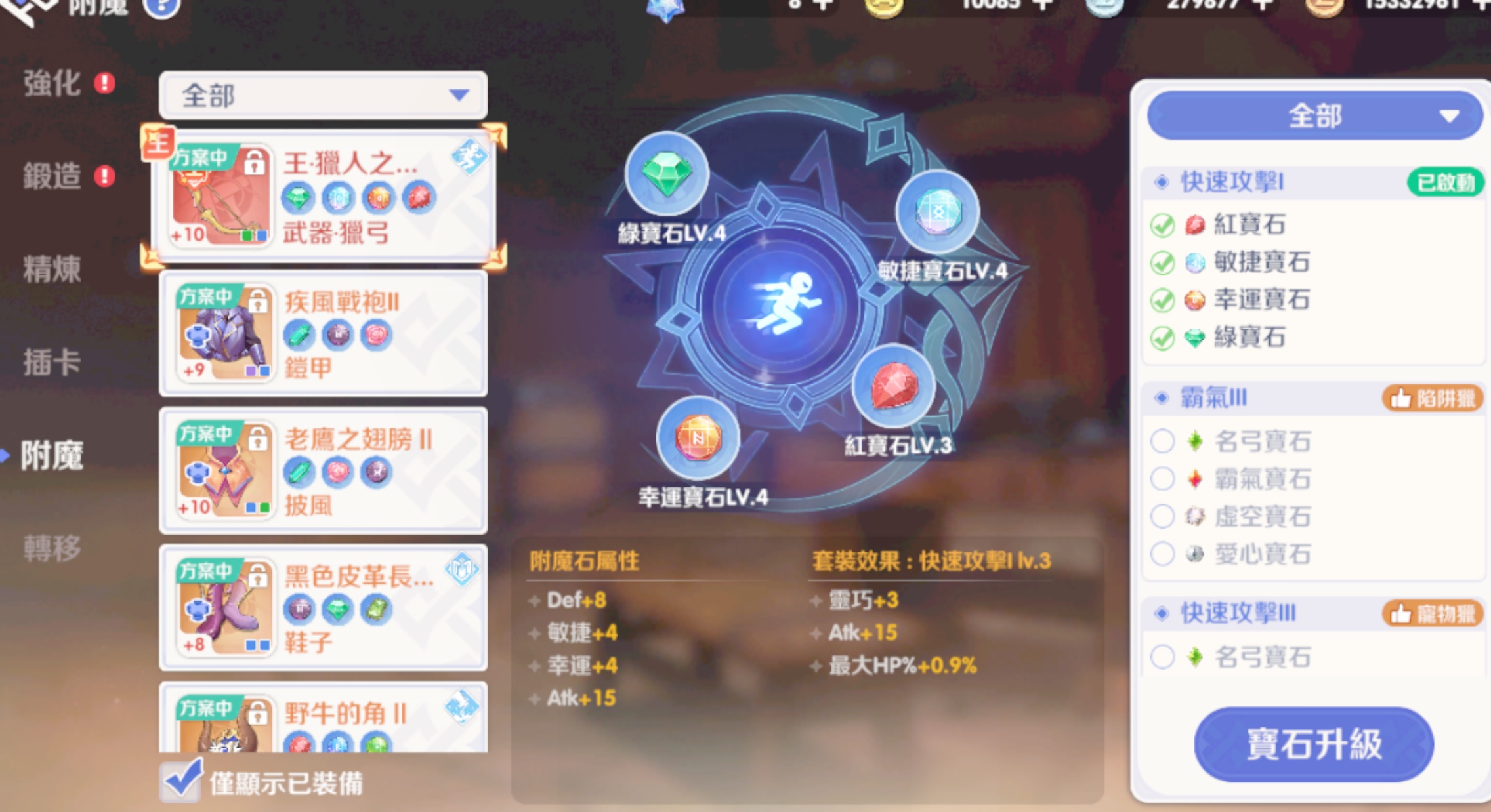 目前身上配置 鳥獵 現階段 各種流派 都有紫3特技