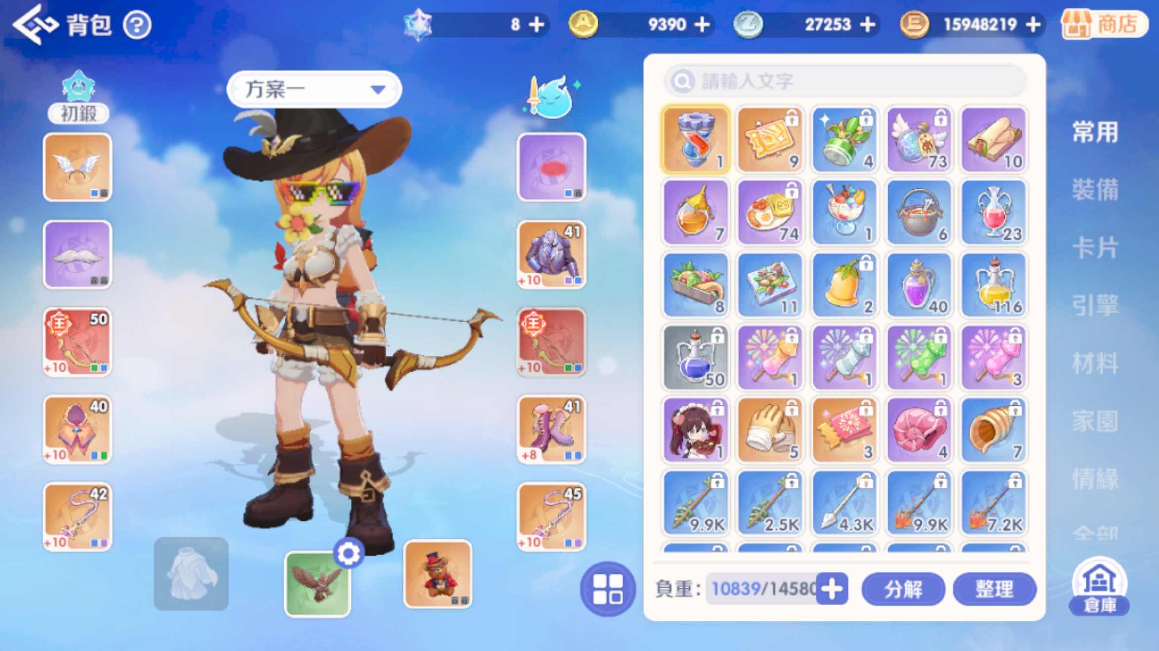 身上穿 1蜈蚣卡 2獸弓 (剩鞋子+8) 其他都上+10了