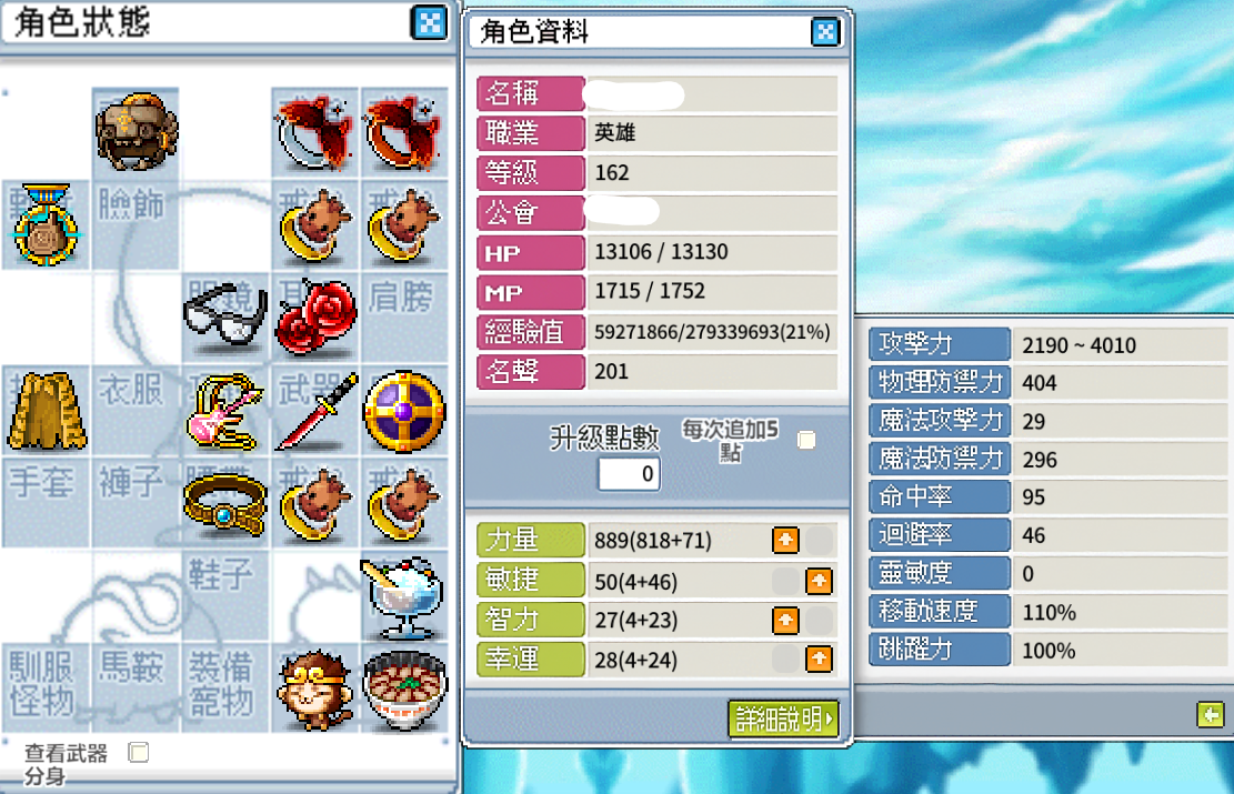背包320格,楓幣約1E5,寵物銀豬及自動施放6造型卷皆有