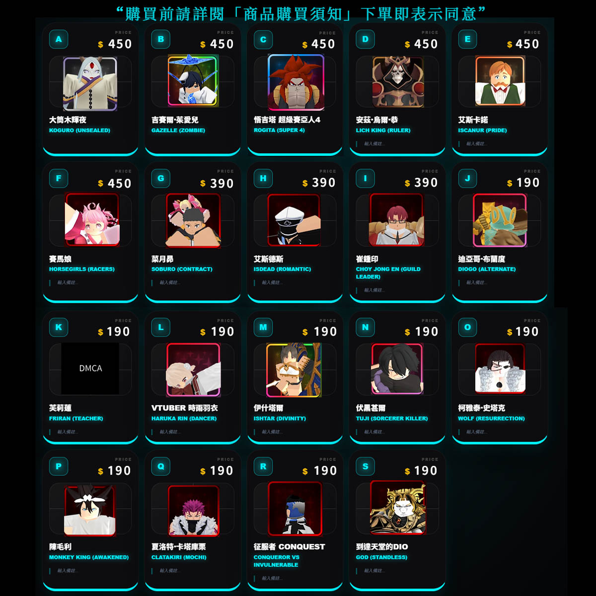 3.本賣場所販售之商品為第三方來源,非遊戲平台官方授權或經銷品項。如因使用該帳號或商品而遭平台限制、懲處、封鎖,風險由買家自行承擔,恕不補償或退換。