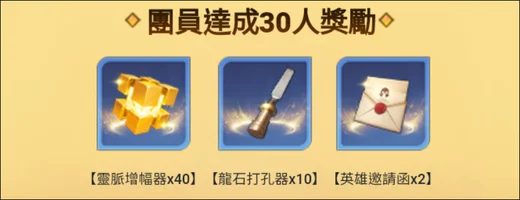 1. 團長獎勵:龍幣*500+靈脈増幅器*50+龍石打孔器*15+英雄邀請函*5