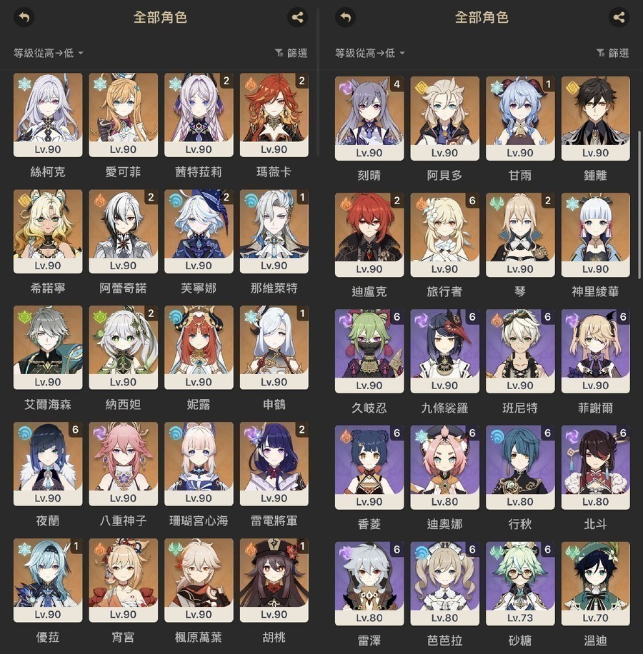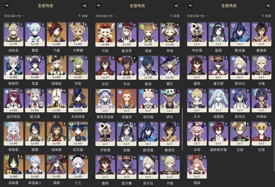 角色都有練度基本上每期危局跟防衛戰都能打滿,本期危局9星、防衛戰全S