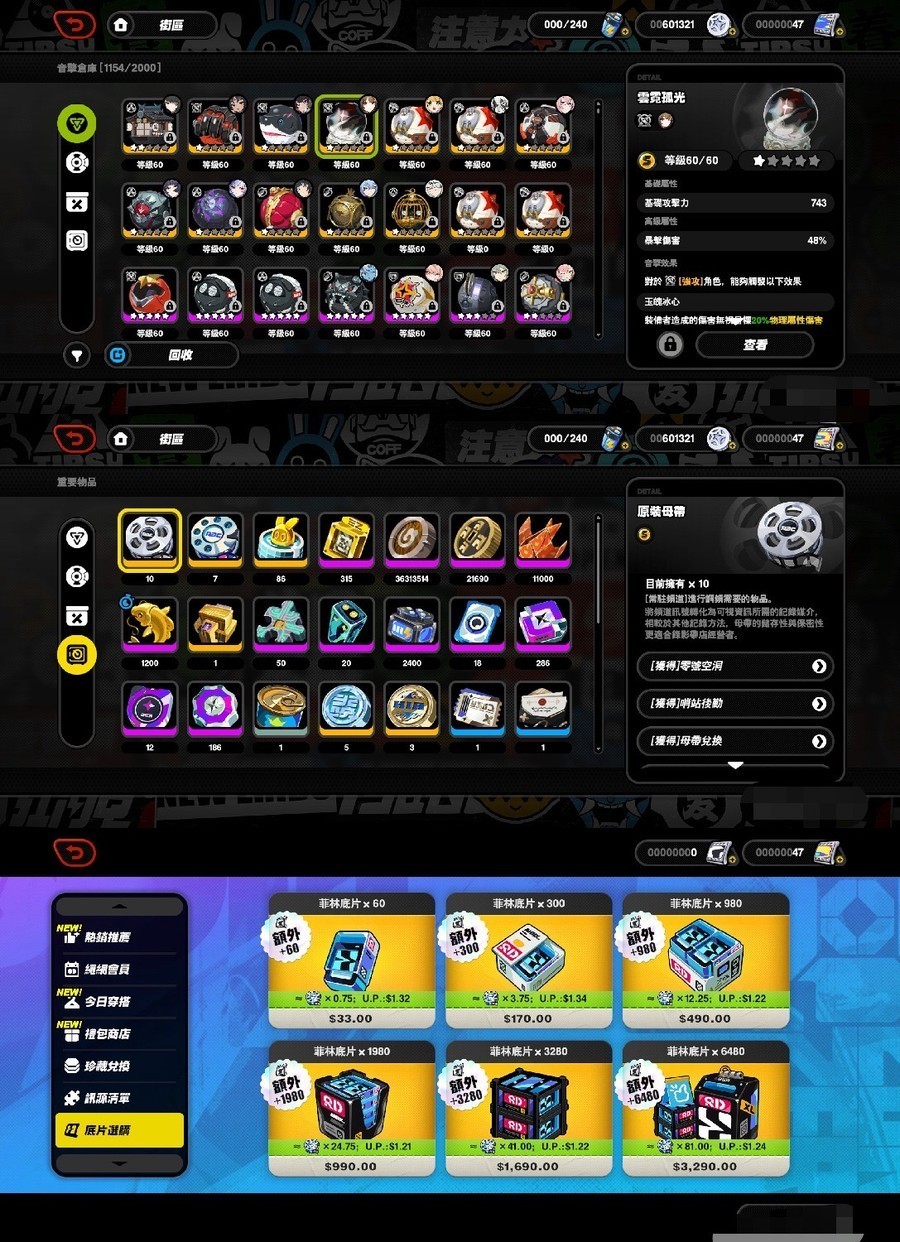 連體崩鐵一起合售,崩鐵已累計登入約700天,主要強勢角幾乎都有練度: