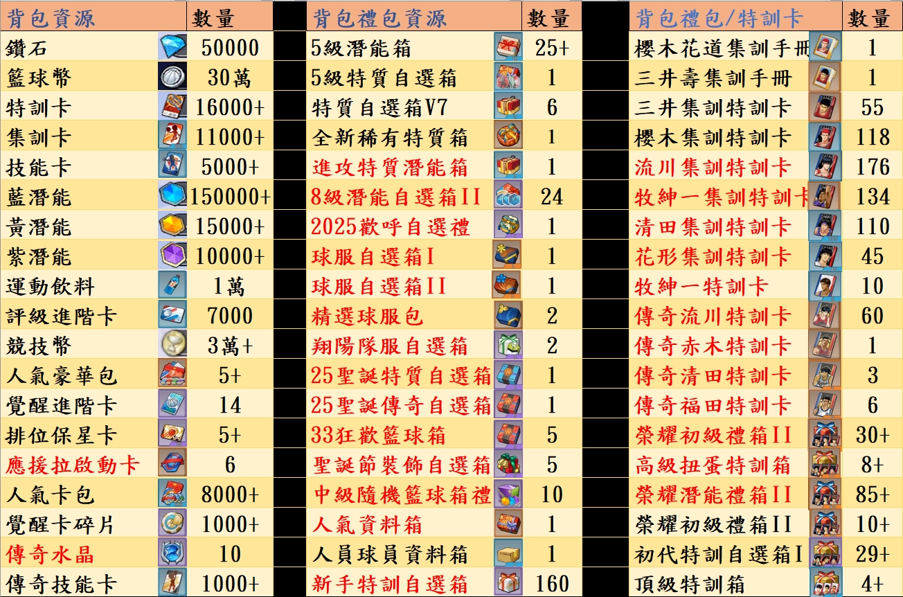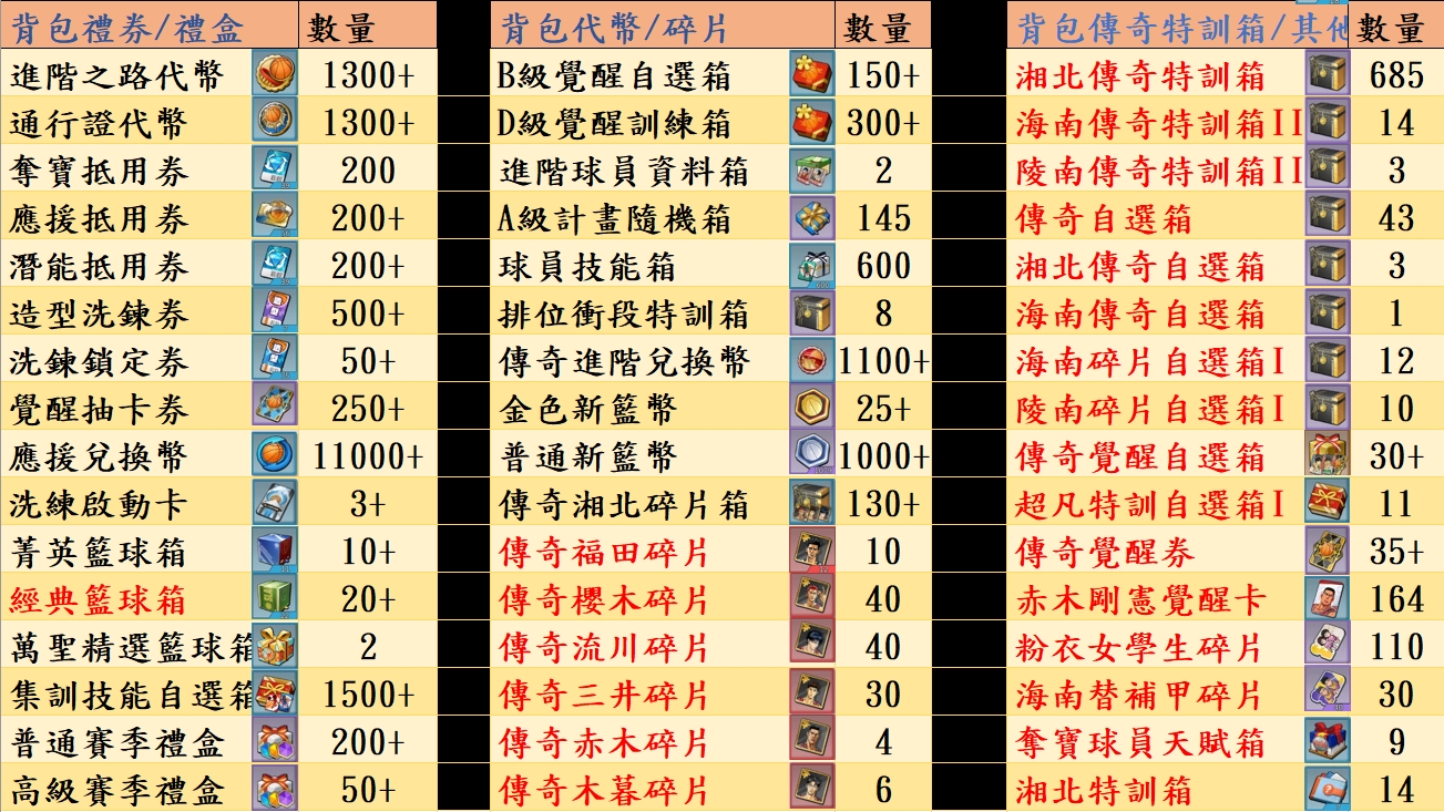 (十)湘北傳奇特訓箱685箱/海南傳奇特訓箱18箱/翔陽傳奇特訓箱4箱/傳奇自選箱64箱/湘北傳奇自選箱3箱/海南傳奇自選箱1箱/25聖誕傳奇自選箱