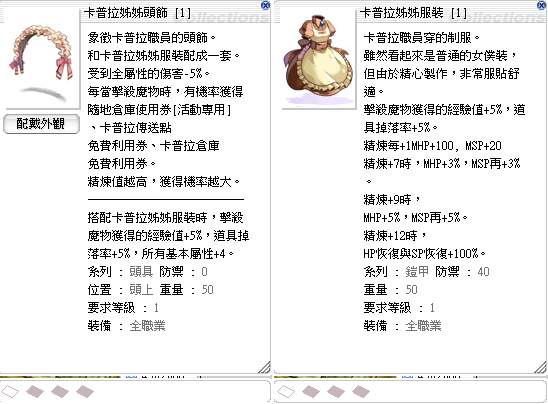 道具 卡普拉姊姊頭飾 [1] +卡普拉姊姊服裝 [1] 經驗值+10% 掉寶+10%
