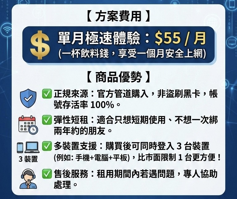 💰 單月極速體驗:$55 / 月 (一杯飲料錢,享受一個月安全上網)