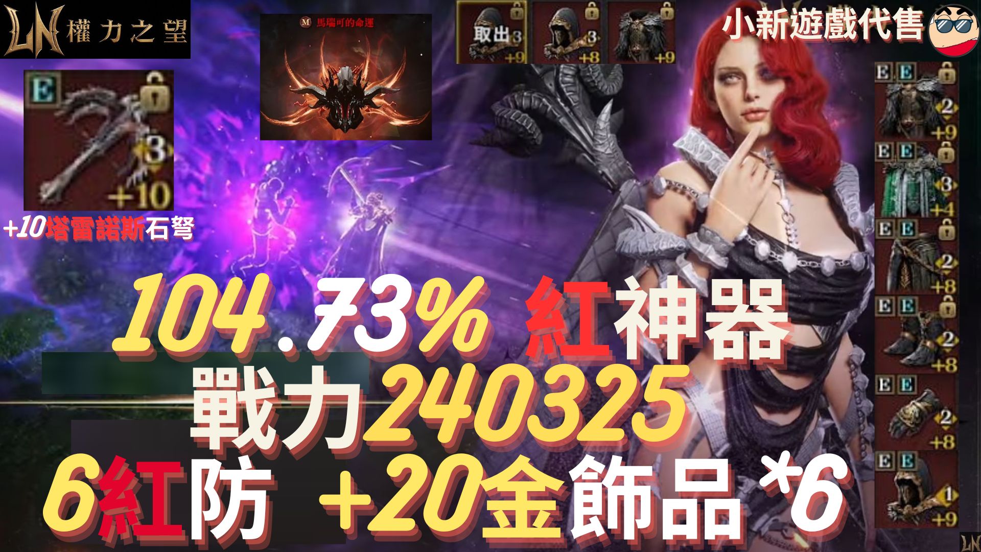 【權力之望】【紅神器專區】:烏蘭7、等級104.73%、戰力240325、+10塔雷諾斯石弩、紅神器、9紅防具、+20金飾品*6、石弩、全包開價20w、EP.44