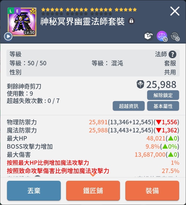 亞一|傑尼斯|20星|神秘冥界幽靈法師套服|等級50|紅雙轉魔攻|潛能HP|暴紋