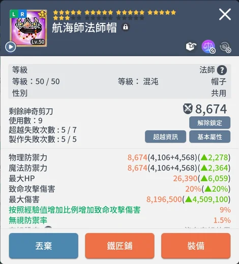 亞一|傑尼斯|23星|航海師法師帽|等級50|綠無視|潛能HP|B紋