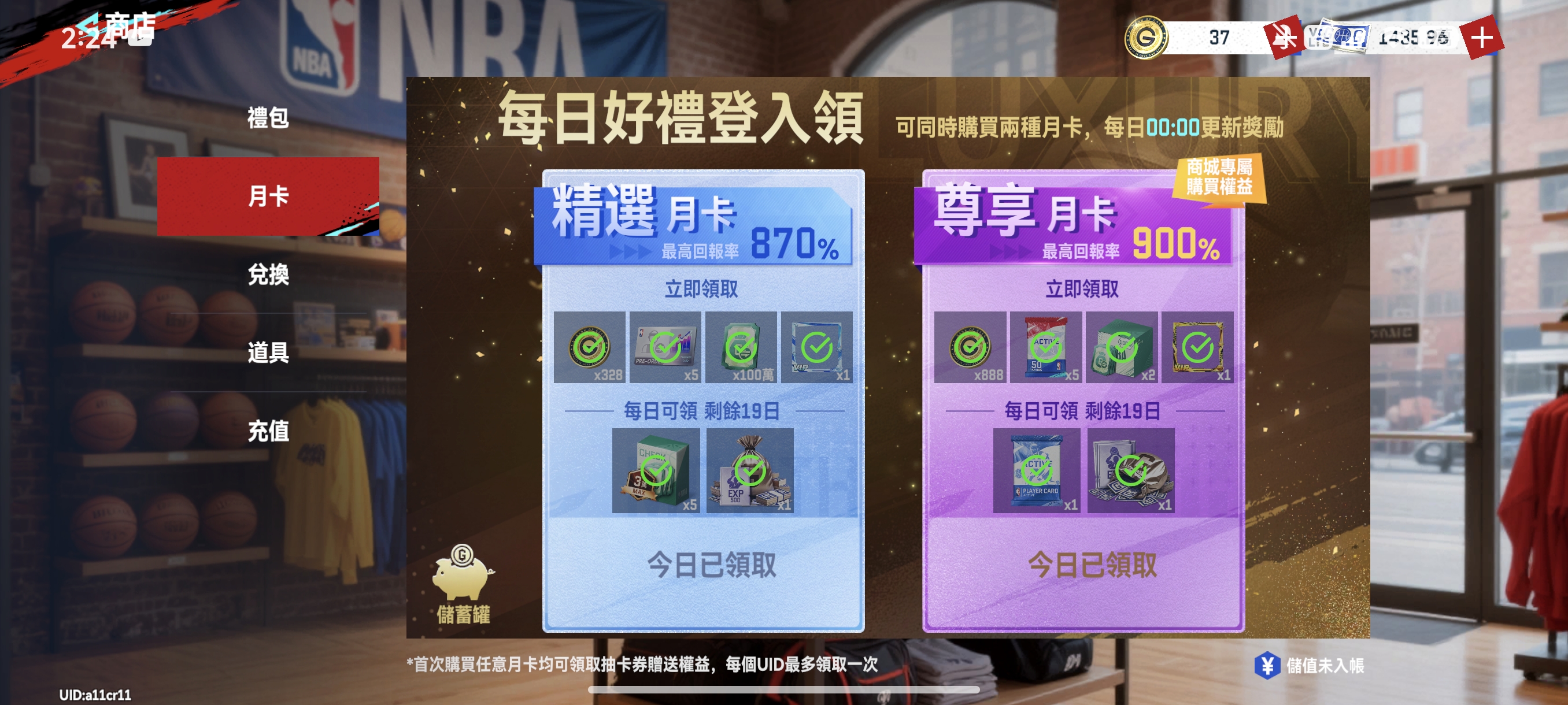月卡已開,至尊和普通皆由