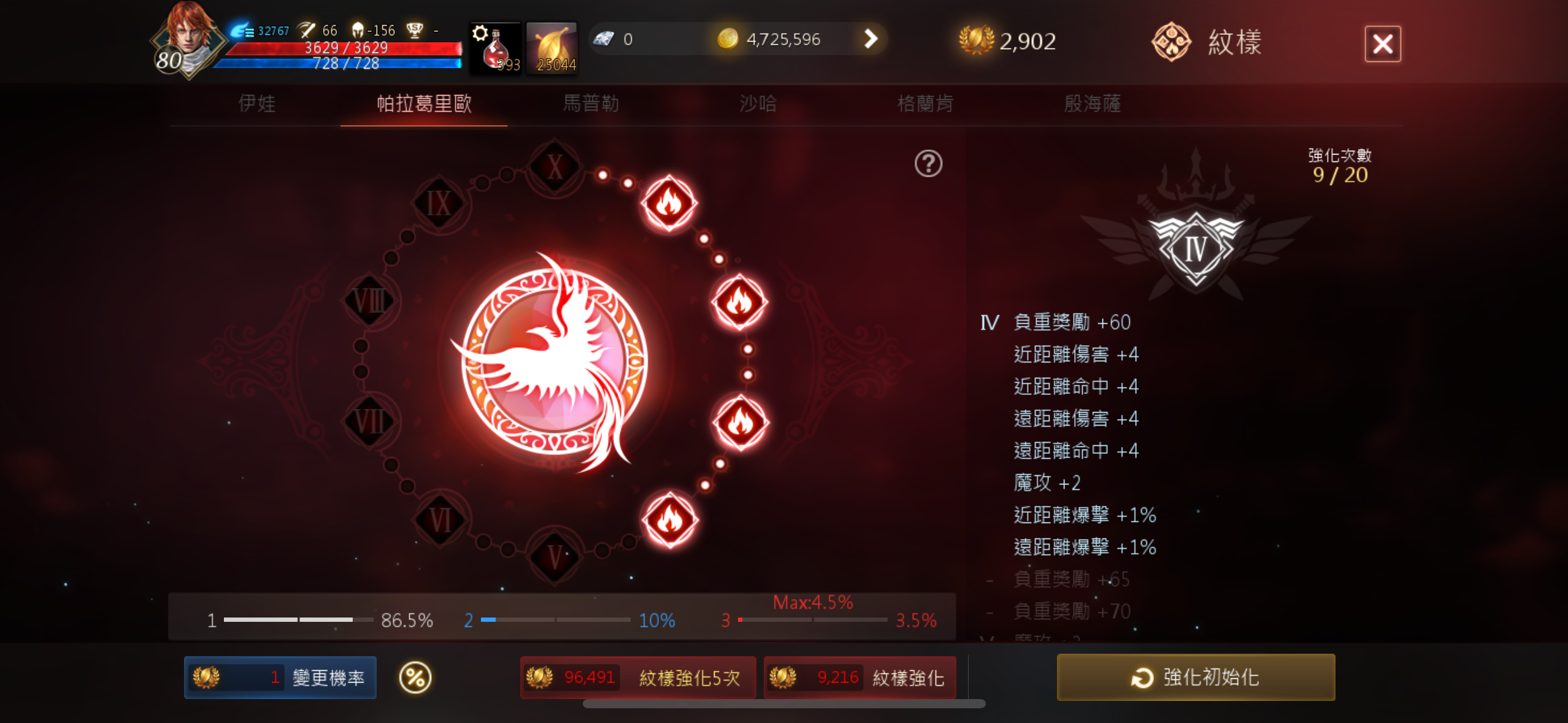 +8大馬士革刀、+4騎士團盔甲、+4騎士團手套(紅裝)、+6武官之盾、+6武官長靴、+6武官頭盔、+5之力量肩甲、+6之力量內衣、+5鐵門褲子、+7抗魔法斗篷