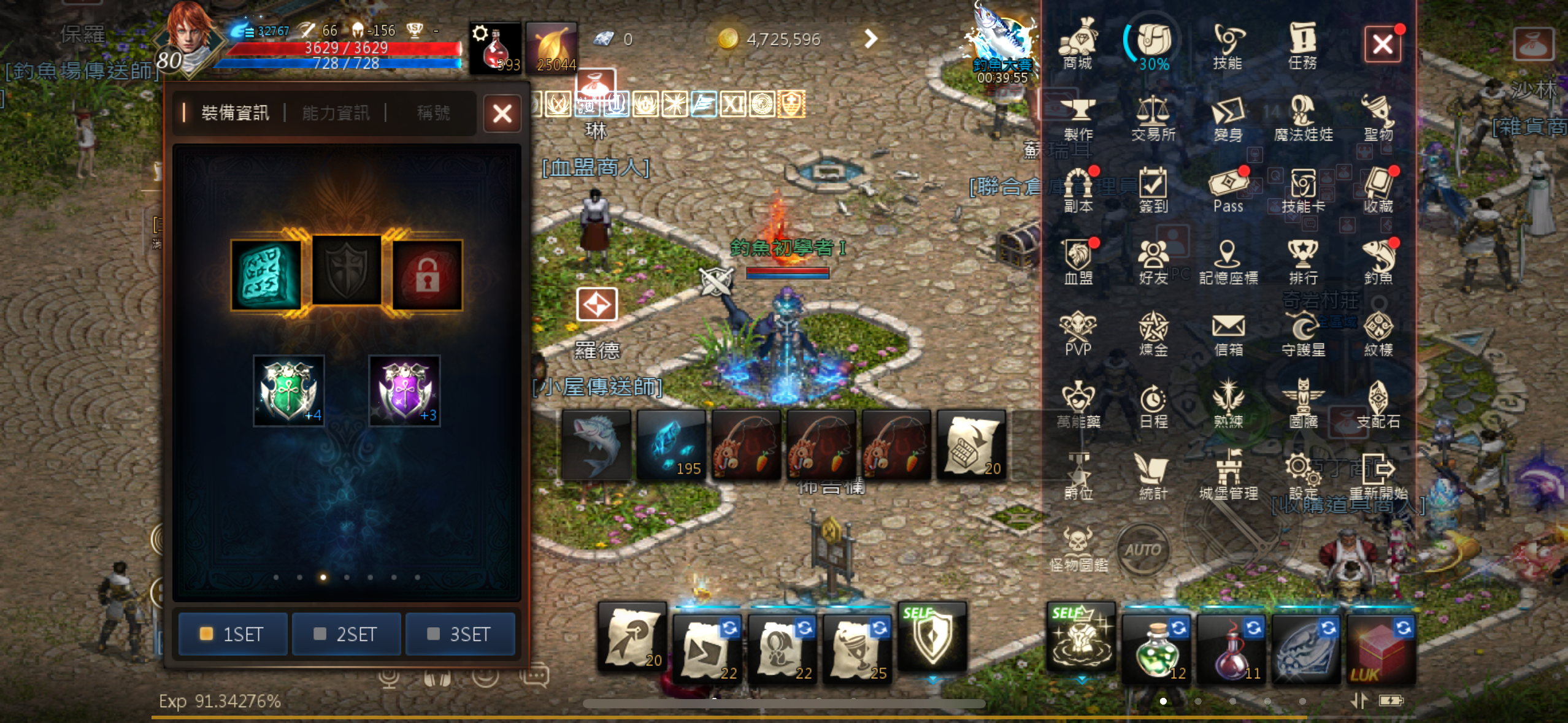 +4祝紅耳、+4祝黑耳、+4祝防禦戒指(攻速+5%)、+3祝防禦戒指、歐吉皮帶、骷髏項鍊、守護戒指*2、成長符石、+3祝回復印章、+4祝守護印章