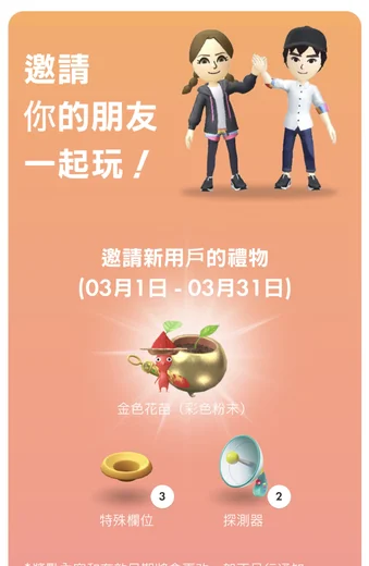 道具 【月份】 好友代碼邀請獎勵 金色花苗*1 特殊欄位*3 探測器*2