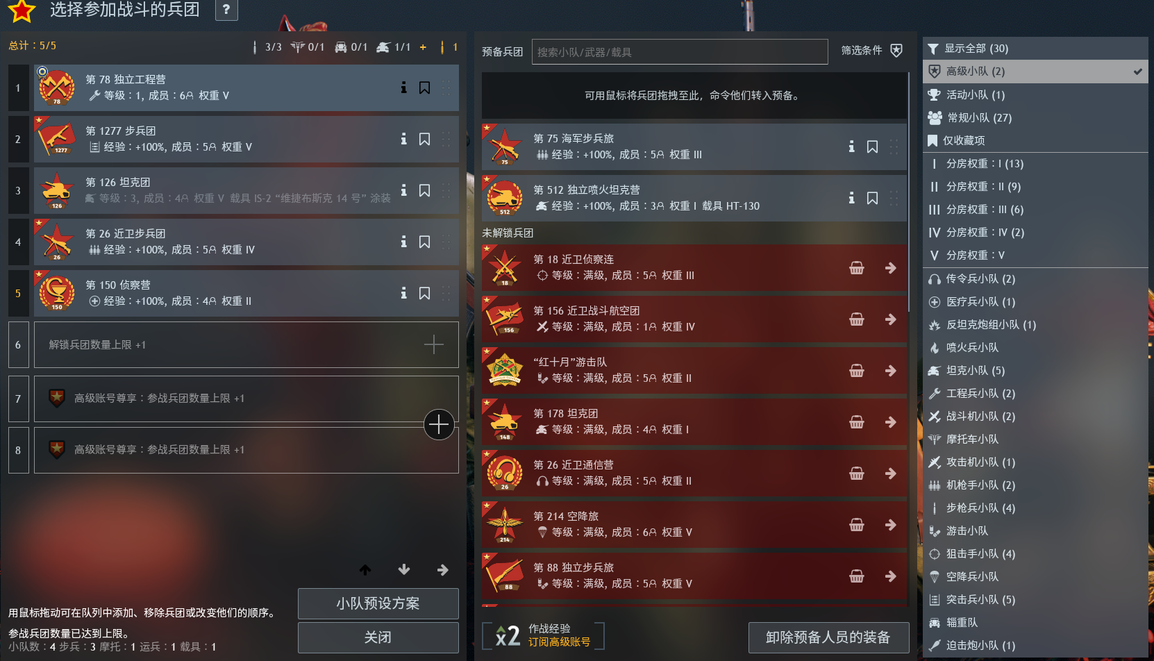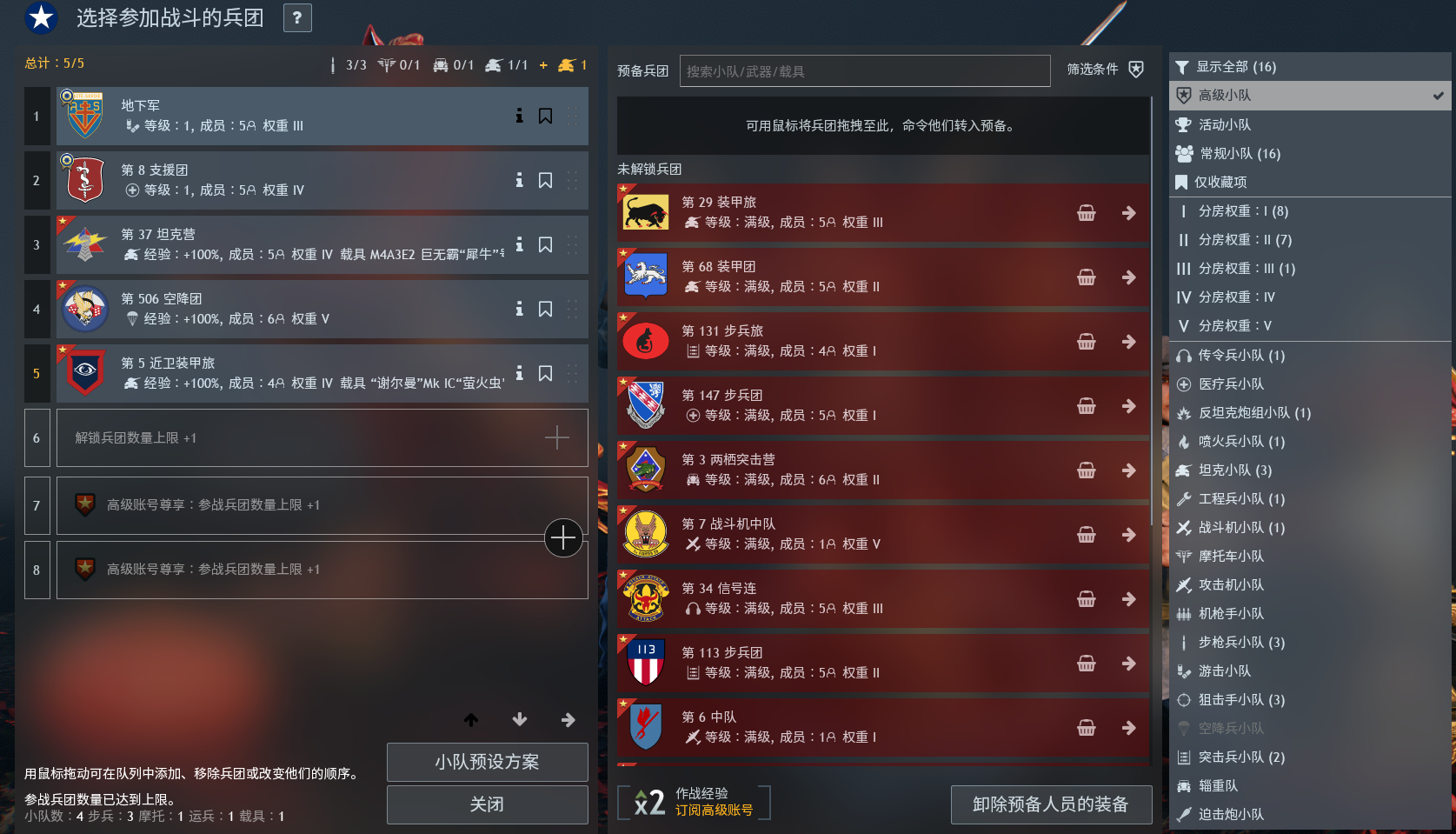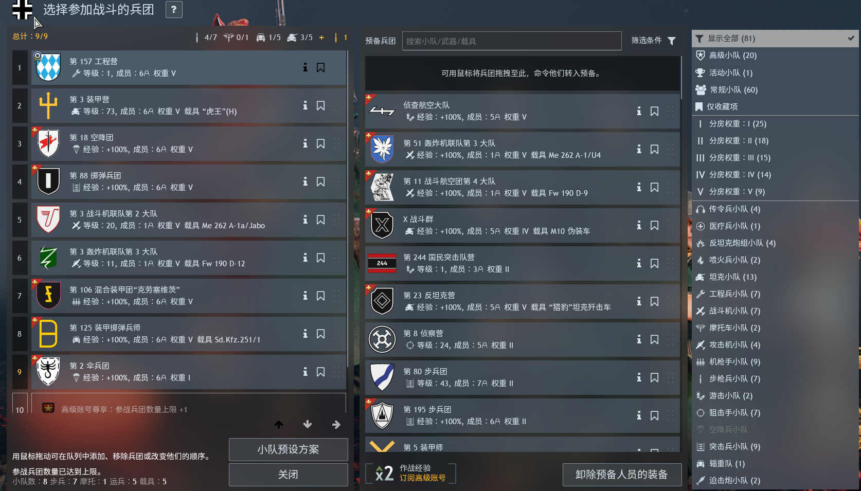 德國高練帳號V階可組到2隊,德國參戰兵團位置已全解鎖