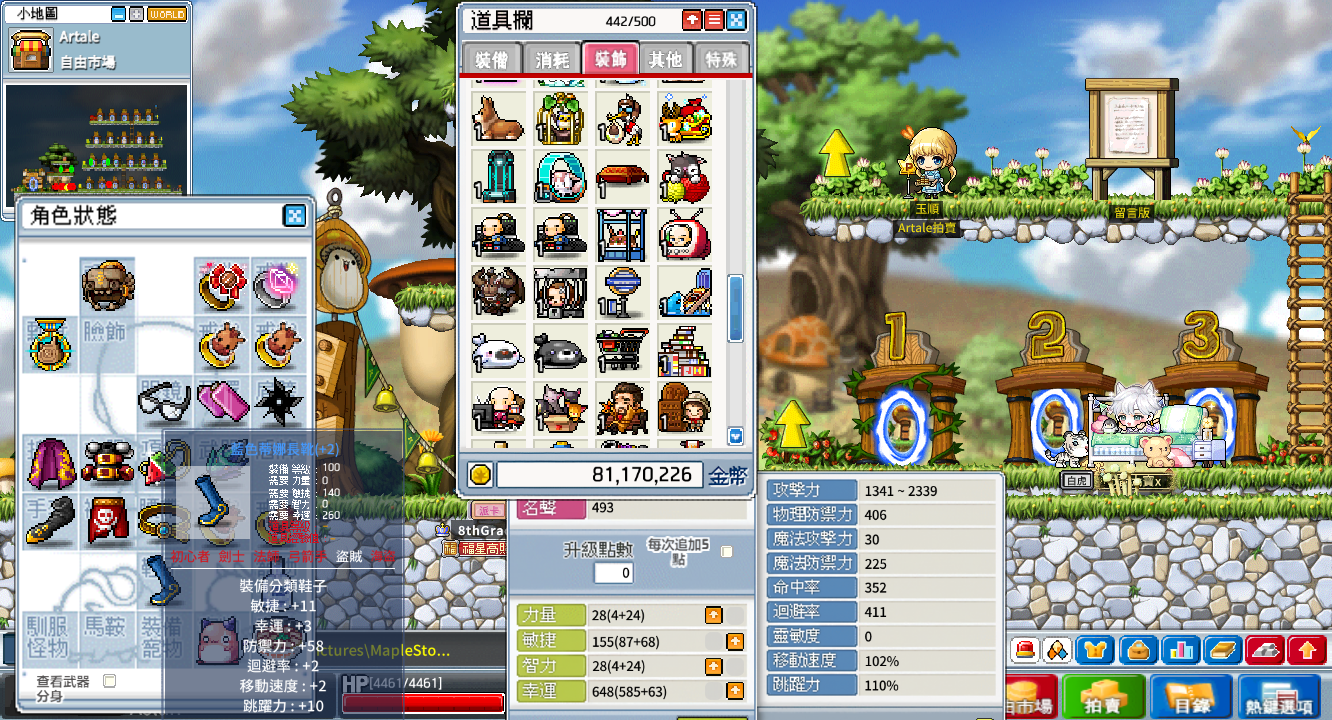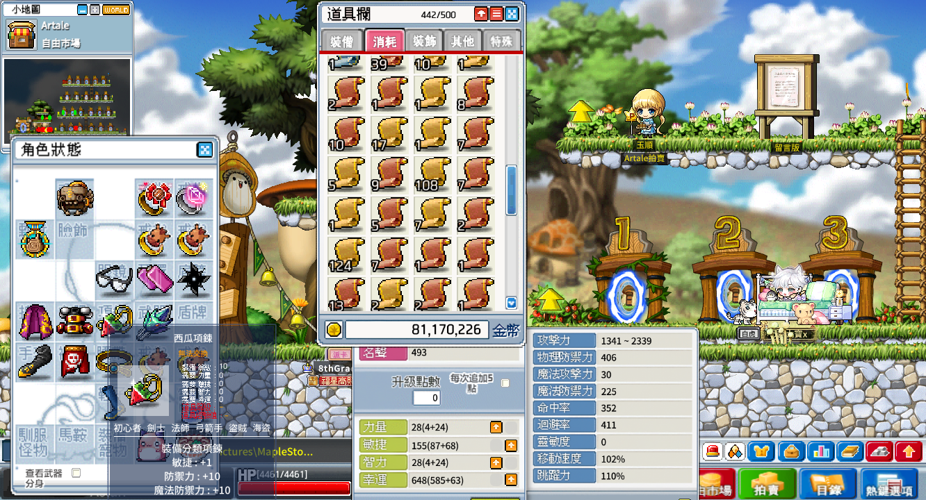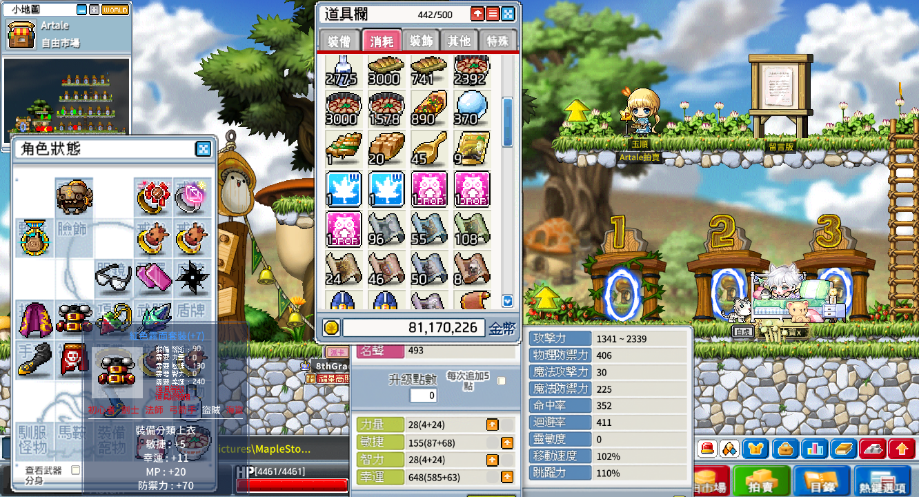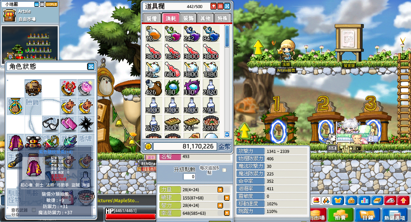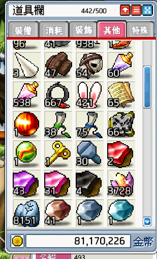 背包資源:500格、楓幣3400w、雪花106個、