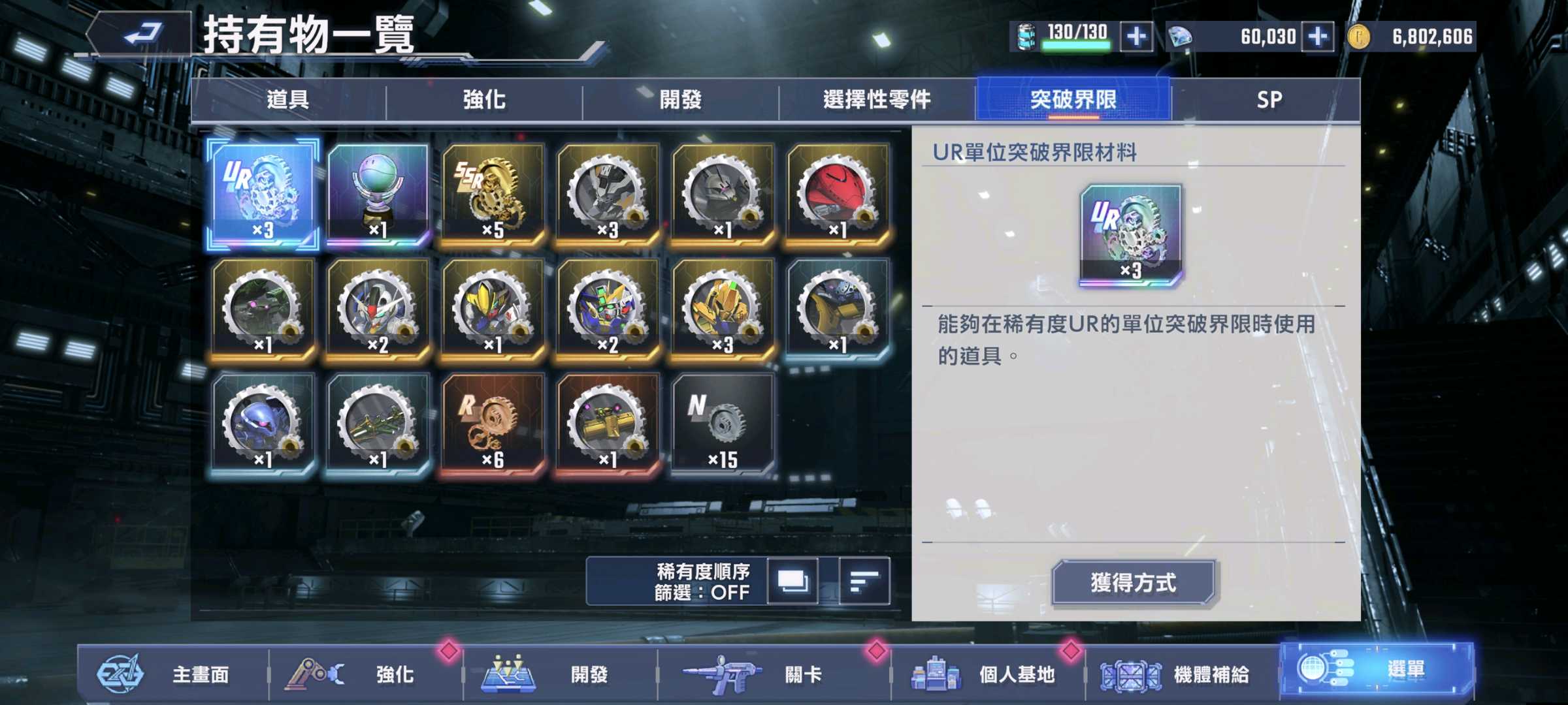 UR突破素材x3、戰艦突破素材x1、SR突破x5