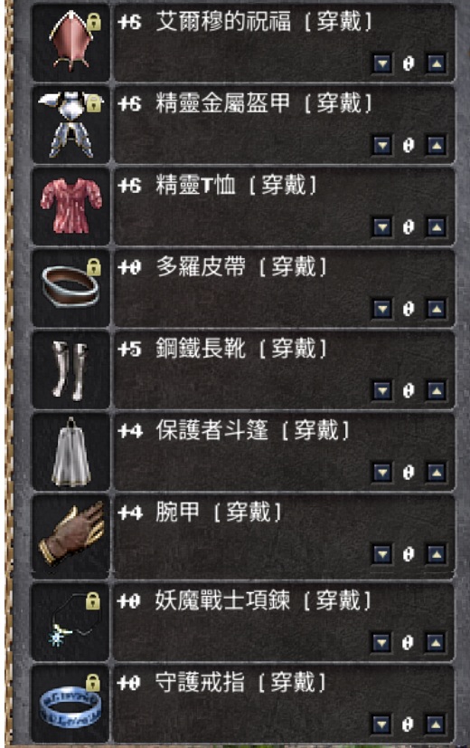 道具 【妖精裝備一套】 艾盔/精金甲/腕甲/精靈T恤/內衣/鋼靴/保斗/多羅皮帶/妖魔戰士項鍊/守護戒指